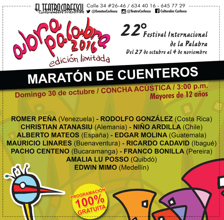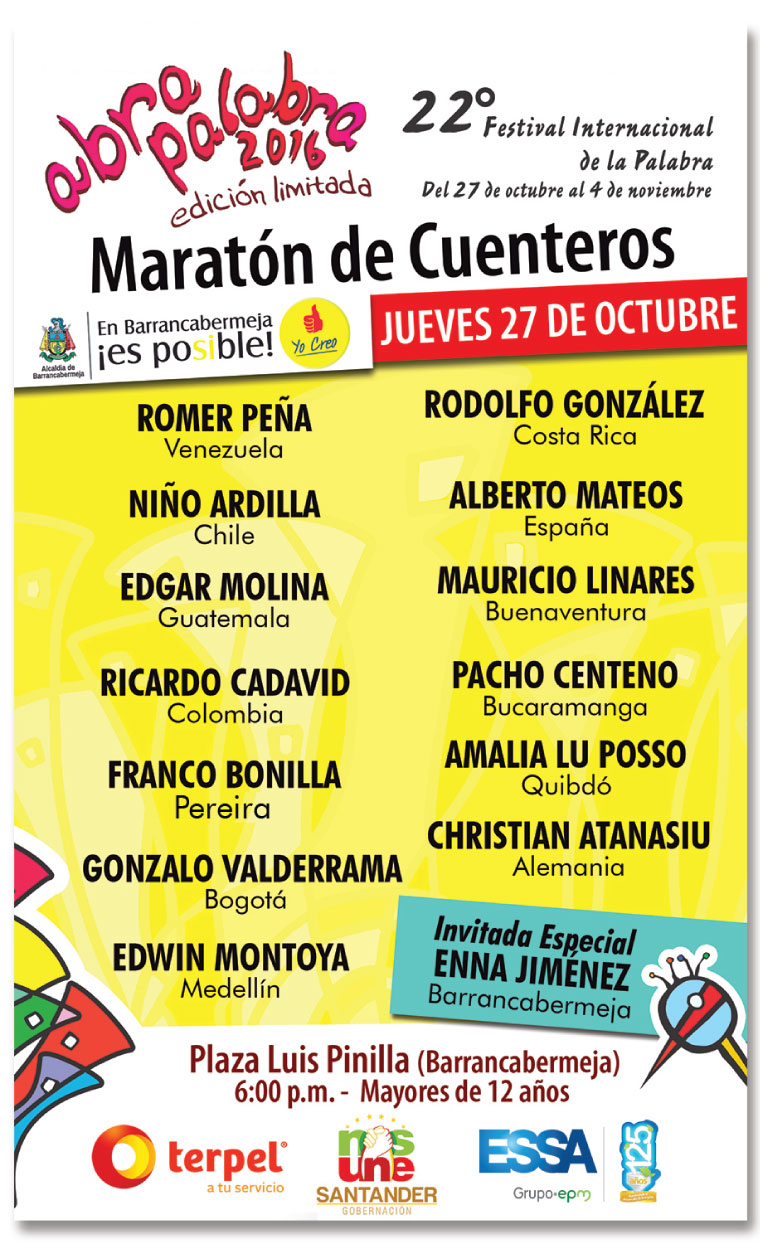 Esta actividad ha permitido que por más de 20 años los bumangueses conozcan la tradición oral de los cinco continentes, a través de sus invitados especiales que nos acercan a los mitos e historias características de sus regiones. En esta oportunidad participarán cuenteros de España, Costa Rica, Venezuela, Chile, entre otros.