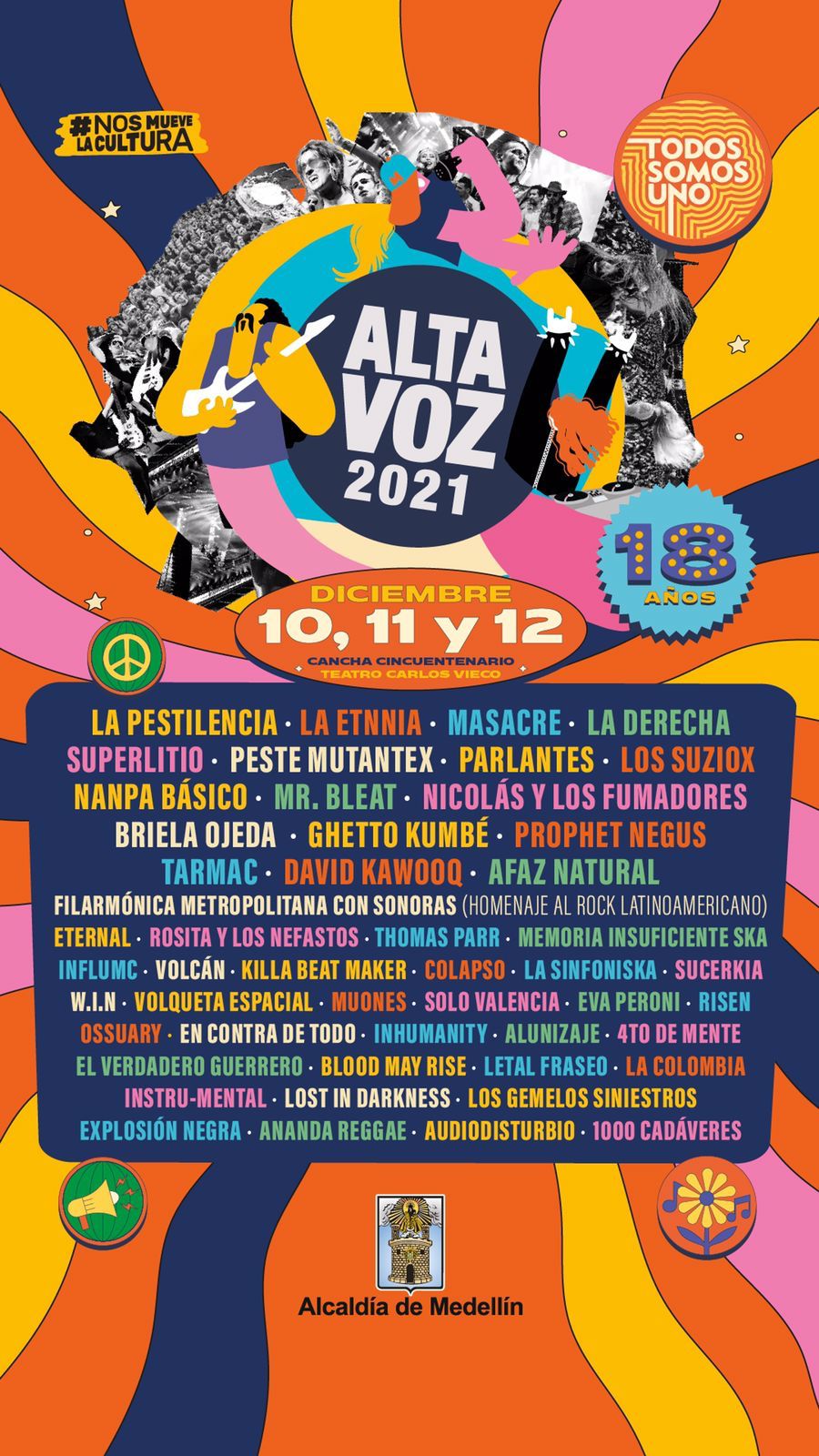 Para esta edición de Altavoz Fest, la número 18, la organización ha construido un repertorio musical integrado únicamente por proyectos, bandas y artistas nacionales. Para ellos, el cartel de la conmemoración de estos 18 años de historia de este proceso de ciudad, que nació para ser plataforma para los artistas de la ciudad paisa, no podría ser otro que uno que recoja bandas que cuenten la historia del país y de la ciudad, y que también puedan proyectar el futuro de los sonidos locales y nacionales.