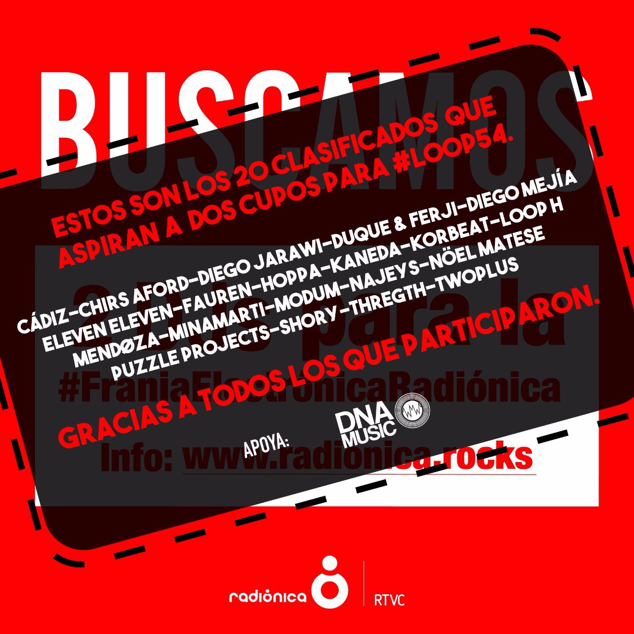 De estos 20 preseleccionados, serán 2 los Djs que harán parte de Loop 54, una celebración que durante 3 días y en 3 ciudades contagiará al mundo de la magia de la música electrónica, celebrando la primera década de la Franja Electrónica Radiónica, un espacio radial en el que cada sábado la radio públoica ha postado por vivir la música electrónica fuera de la disco y la pistas, para llevar a los oyentes la actualidad musical electrónica del mundo y convocar a los artistas nacionales en torno a las tornamesas.