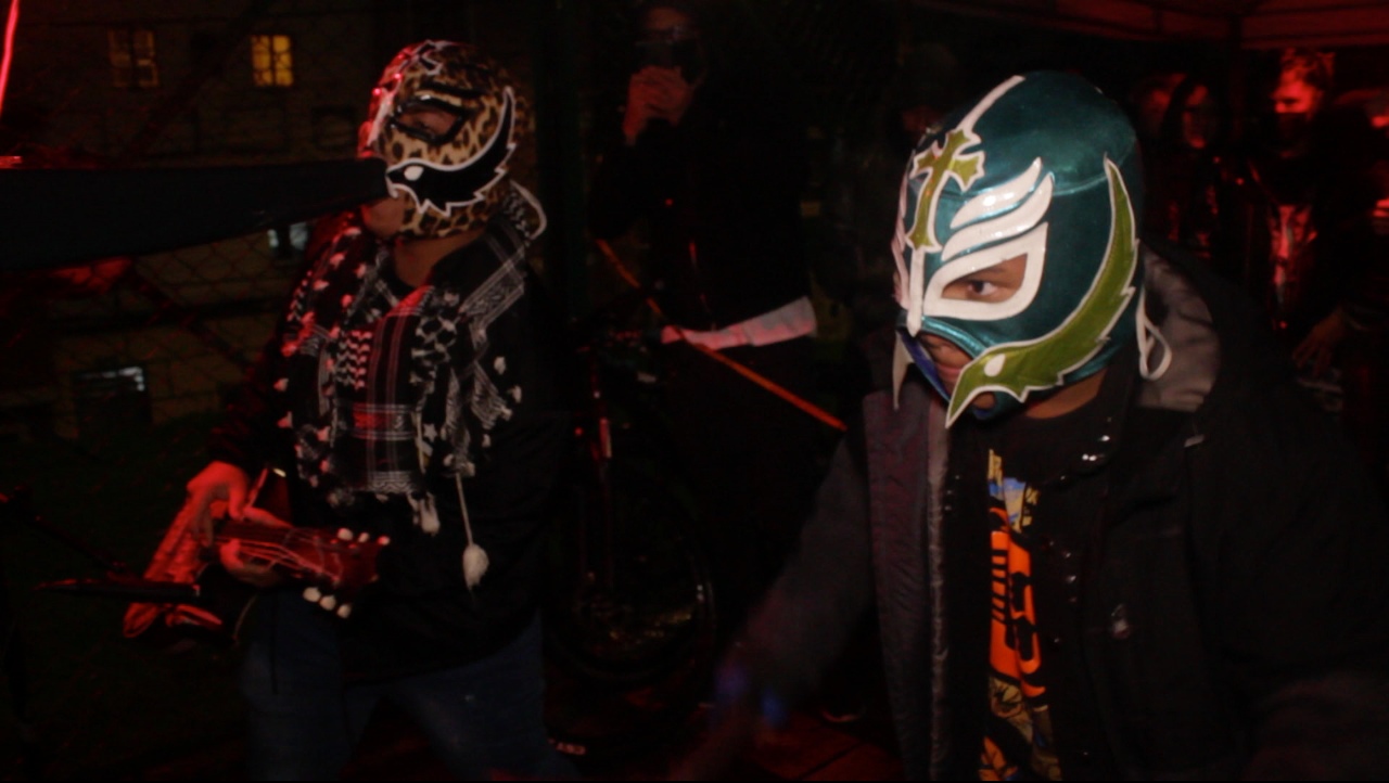 Ambos se subieron con unas máscaras de luchador mexicano y unas chaquetas negras. Rata tenía una camiseta de Dragon Ball y su hermano usaba una bufanda de cuadros negros y blancos. El inicio de la presentación fue un poco tímido. Pero a medida que entraron en calor se fue poniendo más intensa la cosa. Rata golpeaba con toda su fuerza las piezas de metal y Peste rasgaba con furia su guitarra mientras gritaba. A veces quedaban en silencio como congelados en el tiempo y la mojada audiencia aprovechaba para aplaudir con ganas. “Toquen más rápido hippies”, gritan desde el público que se acercó lo más que pudo a la carpa para ver a estos dos jóvenes hermanos, literalmente, romperlo todo.