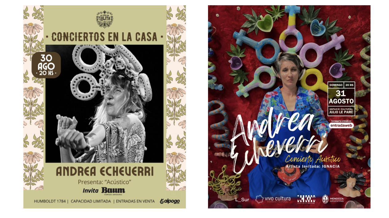Para cerrar con broche de barro, el 30 de agosto Andrea estará dando un concierto único e íntimo en La Casa Lolita (Buenos Aires) y el 31 de agosto en la Sala Tejada Gómez del Espacio Cultural Julio Le Parc (Mendoza). El repertorio, rock femenino que penetra oídos, navegará entre Genes rebeldes, Ruiseñora y Claroscura. Florecerá y germinará: con Ignacia Etcheverry, a su lado, celebrarán su árbol genealógico compartido de rebeldía lúdica perpetua. A esto le llamarán: Las Chéveres.