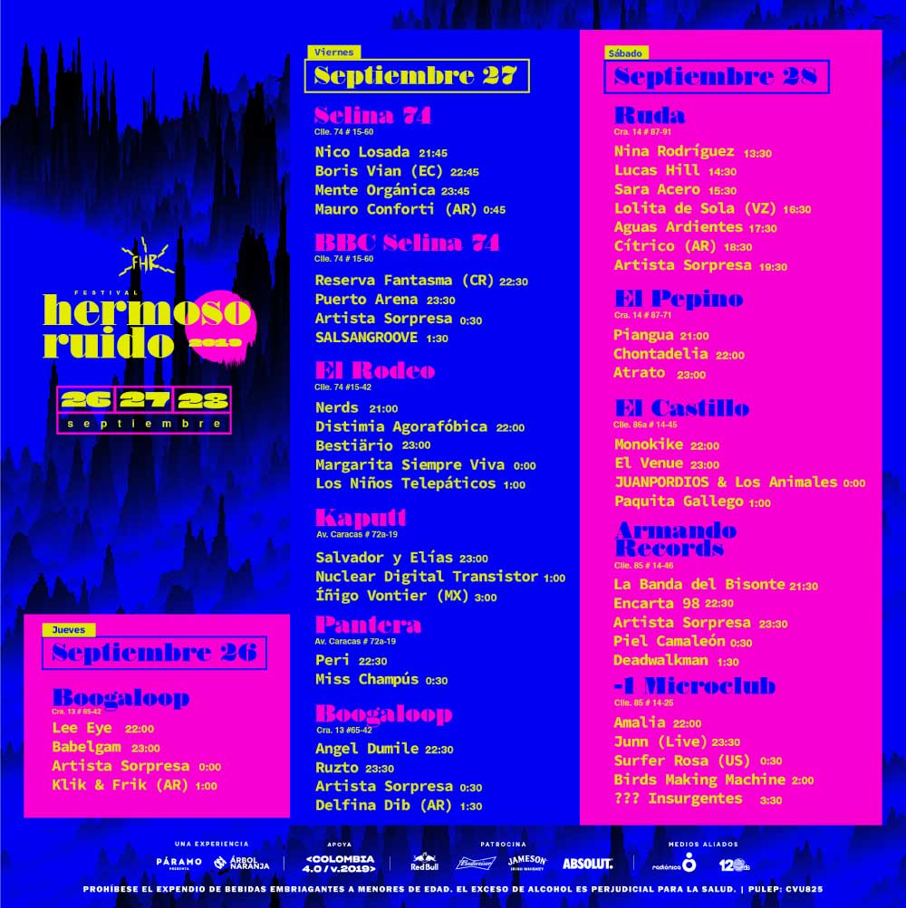 Este año en Hermoso Ruido se podrán ver en 3 días a más de 30 bandas del país y Latinoamérica, 70 horas de sonidos que nos permitirán dar fe de la diversidad sonora y de la amplia oferta que existe en Bogotá.