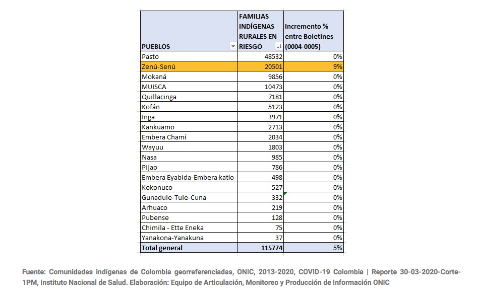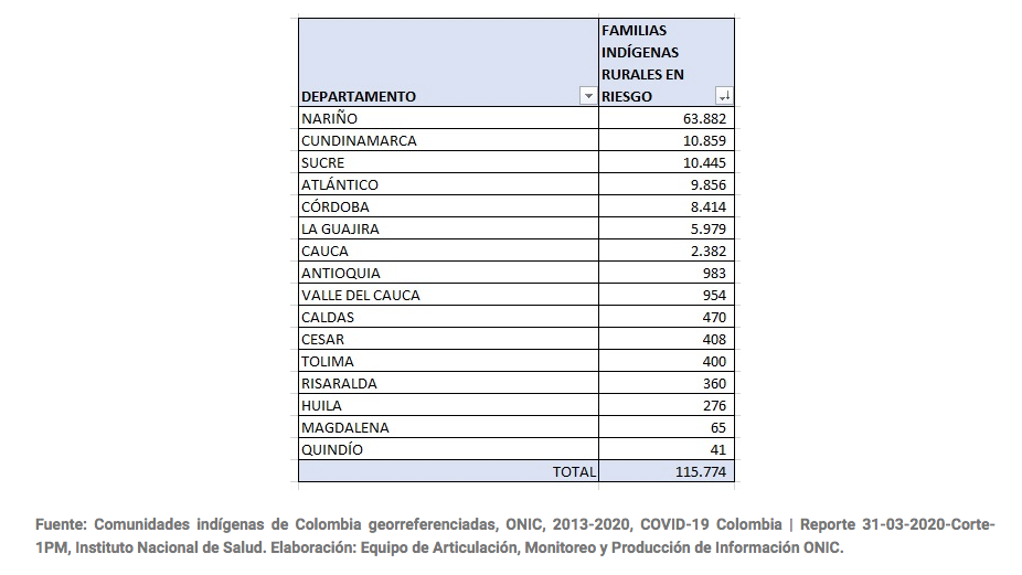 Según el último boletín de la ONIC, publicado el 1 de abril, acorde con el Sistema de Monitoreo Territorial implantado, existen alrededor de “115.774 familias indígenas - 5% más que en boletín número 4 publicado el 31 de marzo- susceptibles de ser afectadas en el corto plazo en caso de continuar el patrón de contagio espacial del virus y la imposibilidad de contenerlo”.