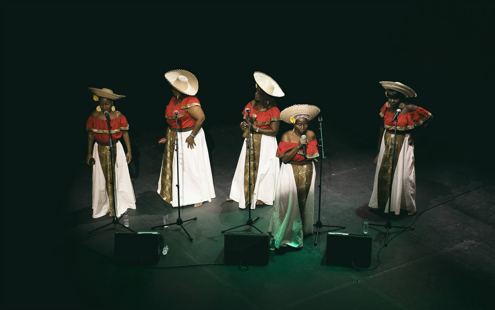 El concierto continúa, pero ahora son once músicos en el escenario. Once sombreros caucanos combinados con camisas azul zafiro y pantalón blanco en el caso de los hombres, y con blusas roja y falda blanca en el caso de las mujeres. El vestuario estaba inspirado en el porte tradicional usado por los músicos y cantoras del pacífico, aunque usaba telas diferentes y diseños frescos con apliques de ropas usadas por distintos grupos étnicos de varias regiones de África occidental, que armaron con material que el productor Julián Gallo trajo de Mali.