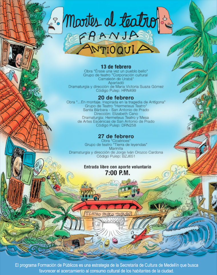 Con el objetivo de unir a la región con el centro de Medellín nace la Franja Antioquia, un espacio de encuentro entre el público de la ciudad y los colectivos artísticos de todo el departamento. Municipios como Urabá, Marinilla, La Ceja, El Peñol y San Antonio de Prado estarán presentes todos los martes desde el 13 de febrero y hasta el 29 de mayo en el Teatro Pablo Tobón Uribe.