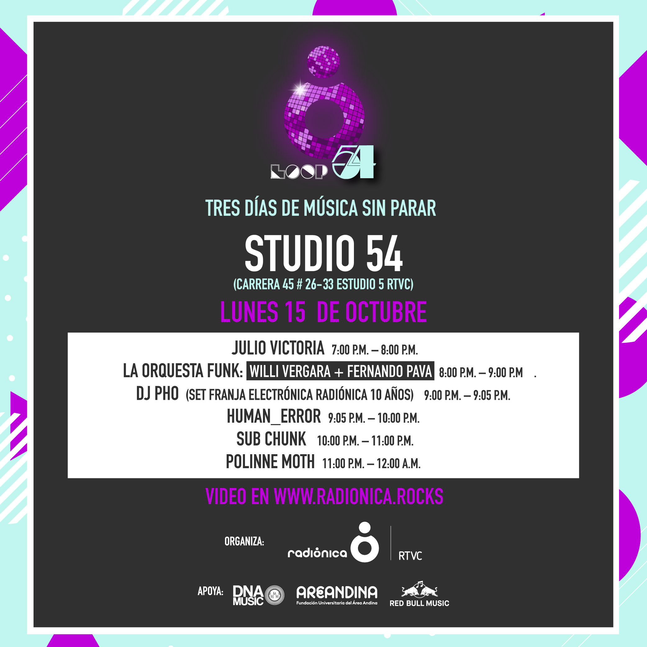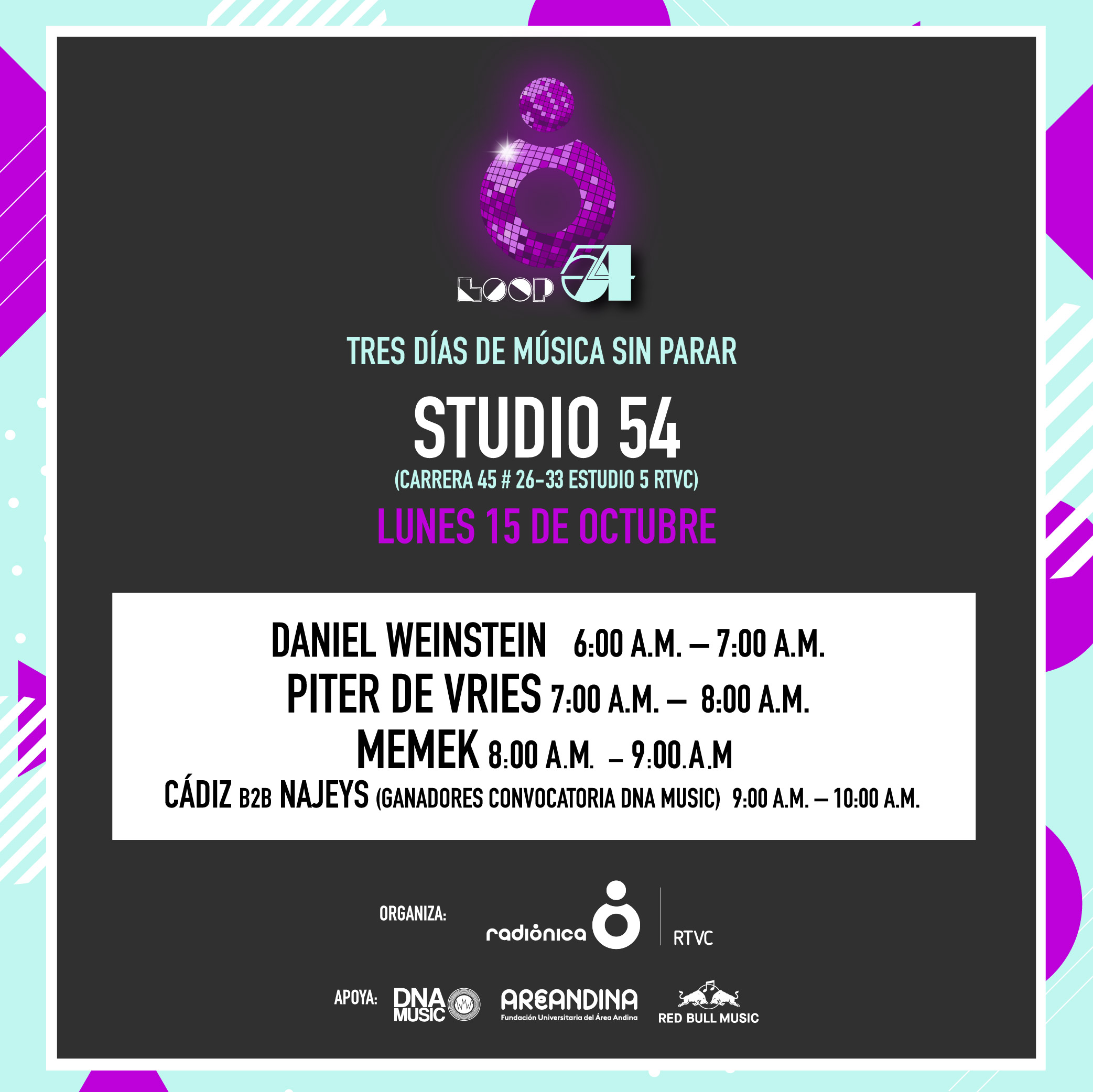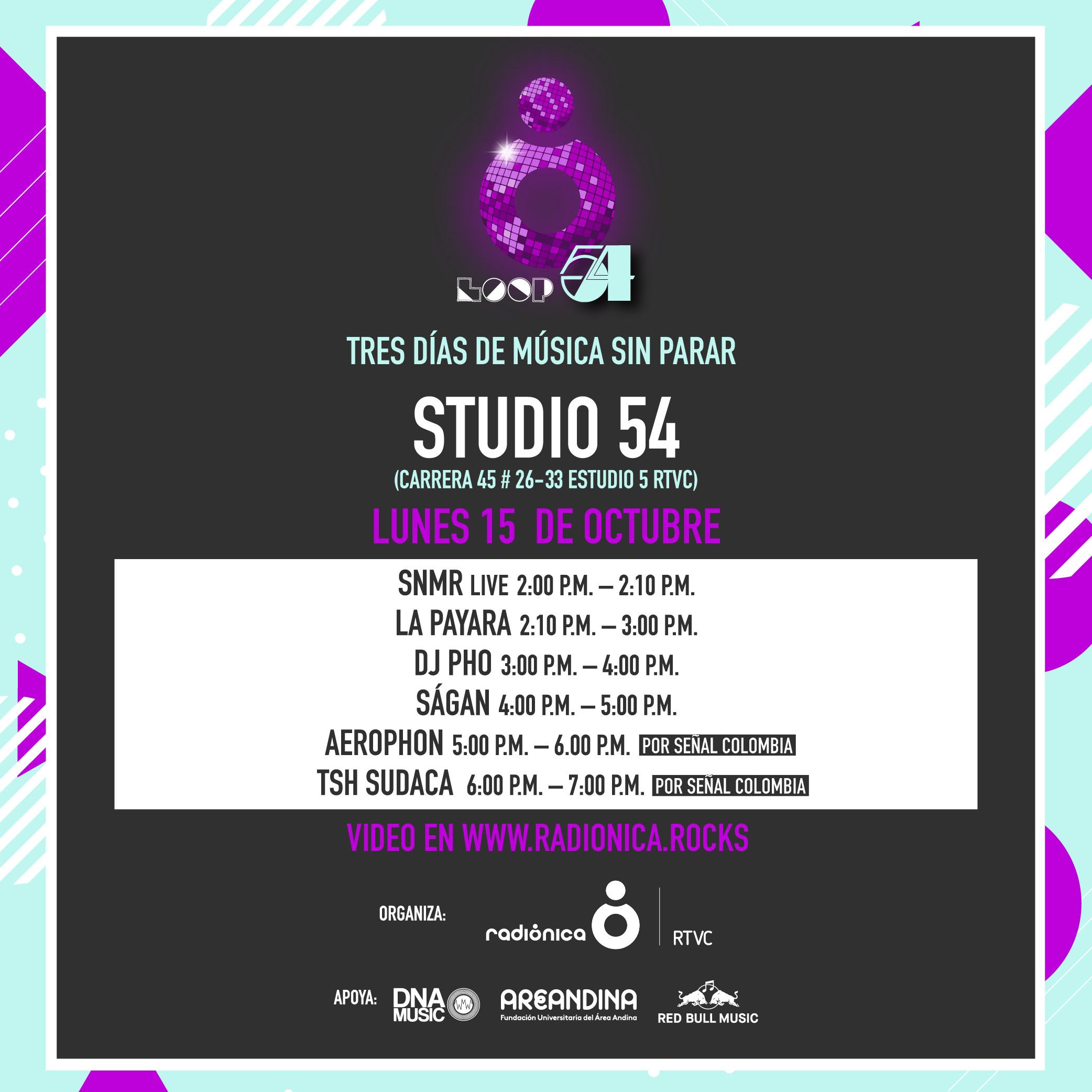 Transmitiremos las 54 horas continuamente a través de nuestra diferentes frecuencias a nivel nacional, y en nuestro audiostreaming en radionica.rocks y en la App Radiónica. Por otro lado, pensando en una experiencia más cercana, transmitiremos EN VIDEO el inicio y el cierre de #Loop54 a través de nuestra página web, momentos en donde, sumergidos en un homenaje a la legendaria discoteca Studio 54 de Nueva York, celebraremos la música y la cultura disco. (El lunes 15 de octubre, entre las 5 PM y las 7 PM, la transmisión se abrirá a la pantalla de Señal Colombia, nuestro canal hermano).
