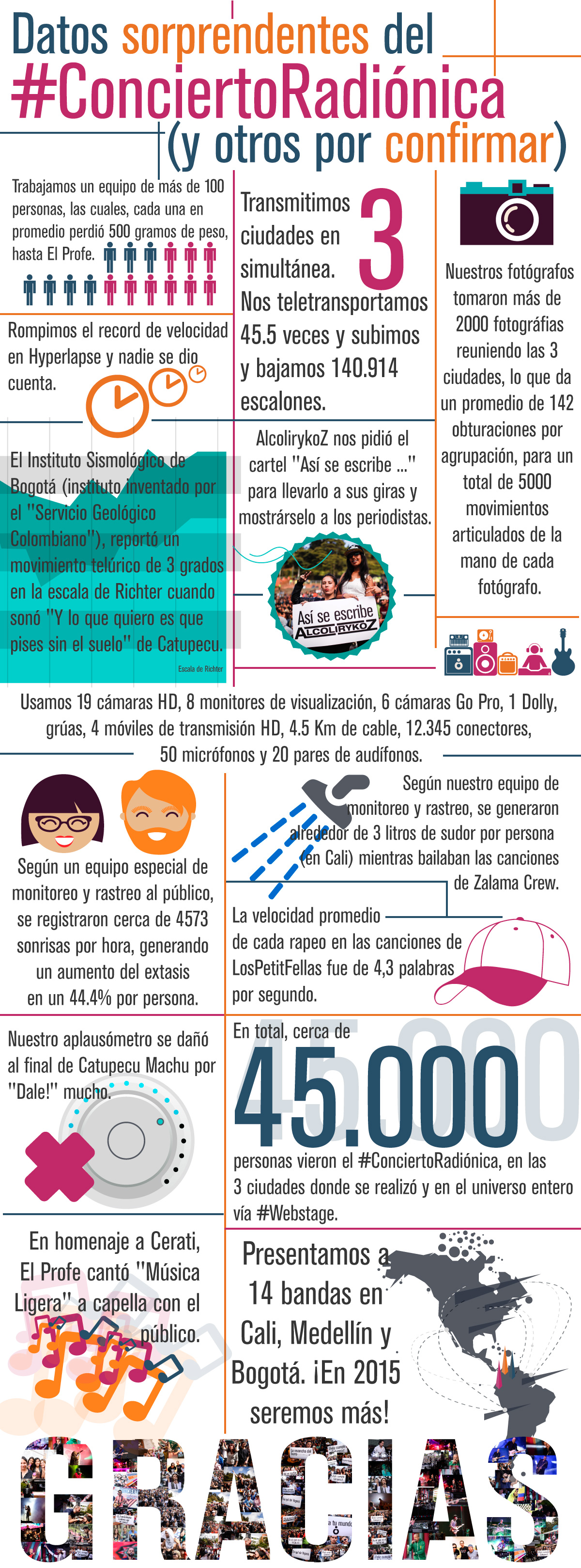 Fueron cerca de 10 horas de tranmisión FM/WEB. Fueron miles y miles de voces finas cantando. Fueron cientos de brazos alzados y miradas al cielo. Fueron muchos días de esfuerzo y preparación. Fueron metros y metros de cable. Fueron muchos momentos de adrenalina, estrés, tensión y satisfacción. Fueron 3 ciudades, 14 bandas y un solo lenguaje: La música. El #ConciertoRadiónica fue todo esto y mucho más. Algunos datos se nos quedarán por fuera, otros en su imaginación, lo cierto es que nunca olvidaremos el día en que todos gritamos a una sola voz, ¡Salva tu mundo, usa Radiónica!