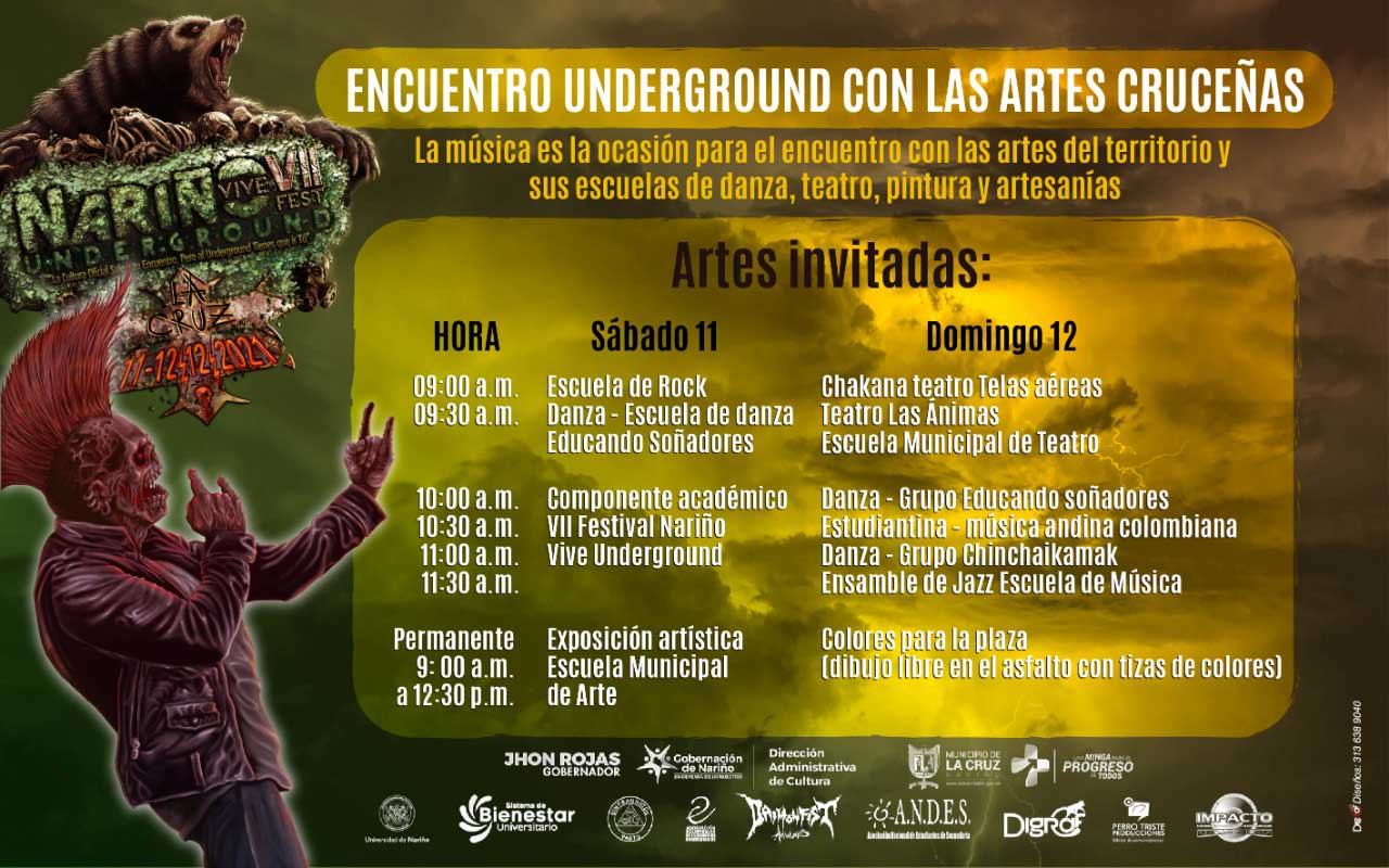 A lo largo de estos años bandas como La Pestilencia, Masacre, Barón Rojo, Nepentes, Rencarnación, Bajo Sueños, Tenebrarum, Peste Mutante y muchas más han pisado el escenario del festival. A pesar de los obstáculos impuestos por la pandemia y la incertidumbre para realizar este encuentro de forma presencial, hay buenas noticias para los amantes del rock y metal: este año Nariño Vive Underground regresa a la plaza pública del municipio de La Cruz. Lo hace con su séptima edición.