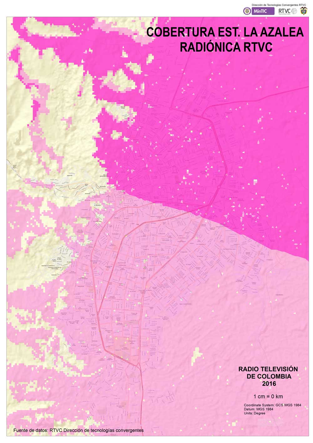 Cobertura La Azalea Radionica anterior: En esta gráfica se puede apreciar en color rosa el área de servicio (66dB) de la emisora Radiónica de la Azalea, antes de la reorientación de antenas realizada durante el año 2015. En esa área de servicio se debe garantizar un cubrimiento excelente de la señal; sin embargo, la señal puede ser recibida con menores niveles de intensidad de campo, con buena calidad de recepción.