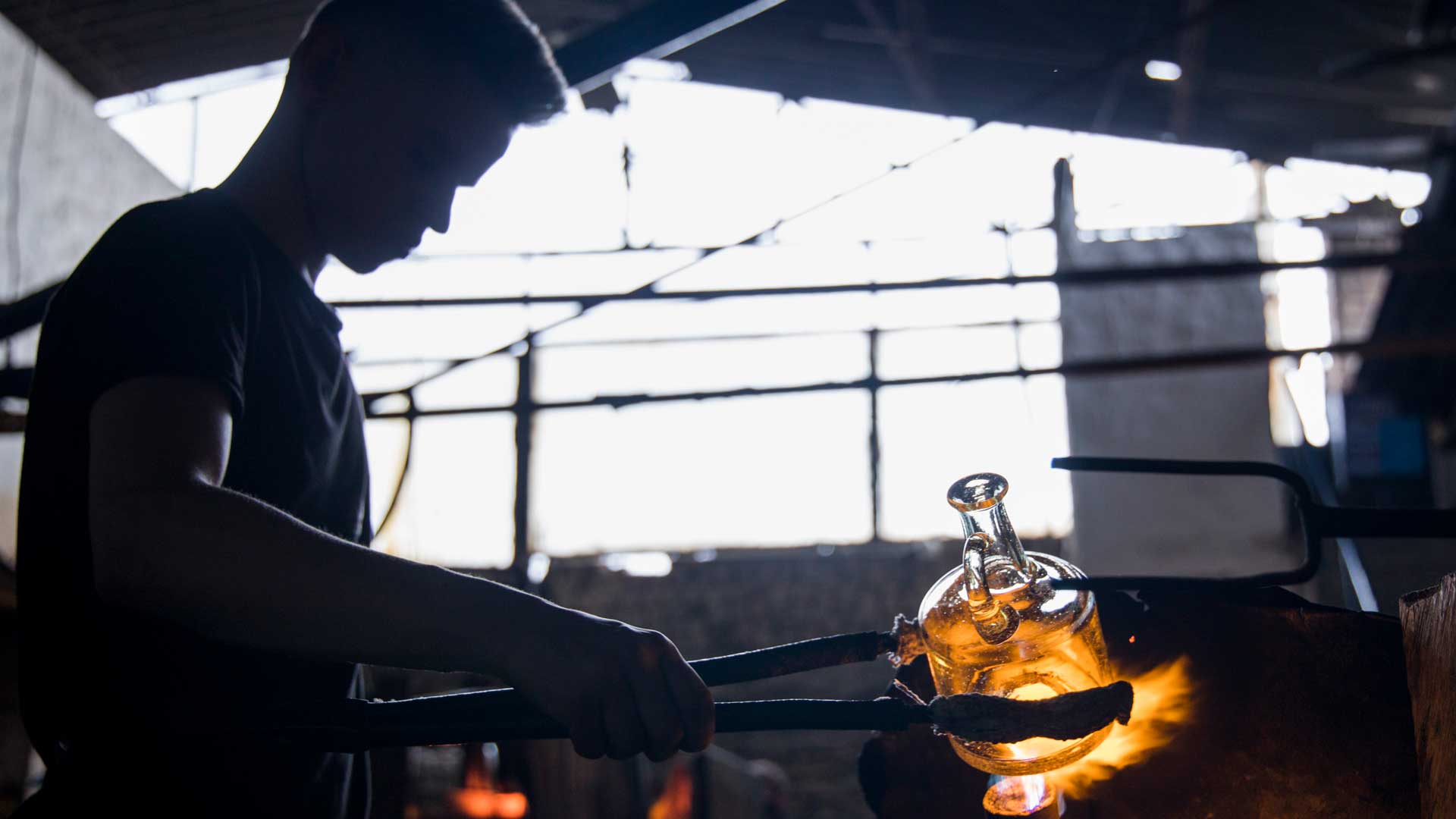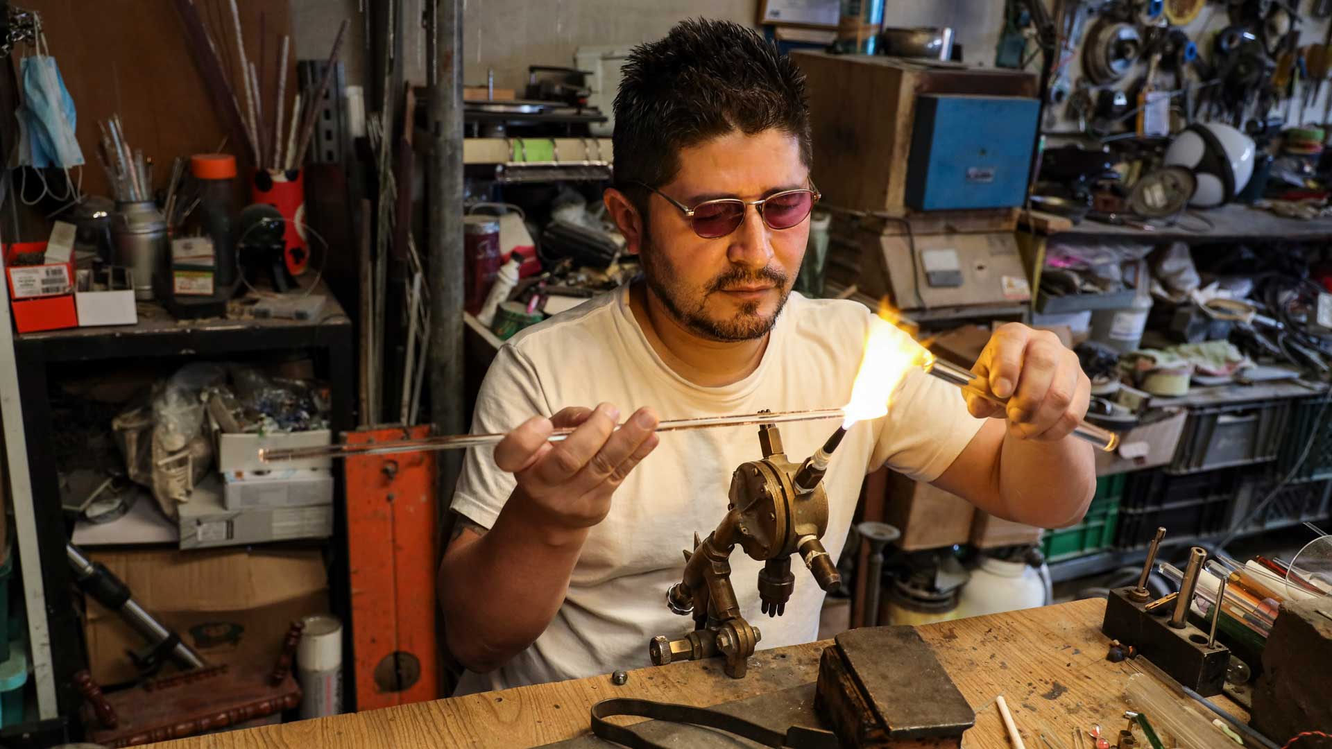 En el taller de John Jairo trabajan la parte decorativa y la funcional. Trabajan con borosilicato, el mismo vidrio con el que se trabajan los materiales de laboratorio. Lo encuentra maleable ya que es un material que no es resistente al calor ni es poroso. Y en caso de que la pieza final no sea la requerida, el material se puede fundir para crear otra.