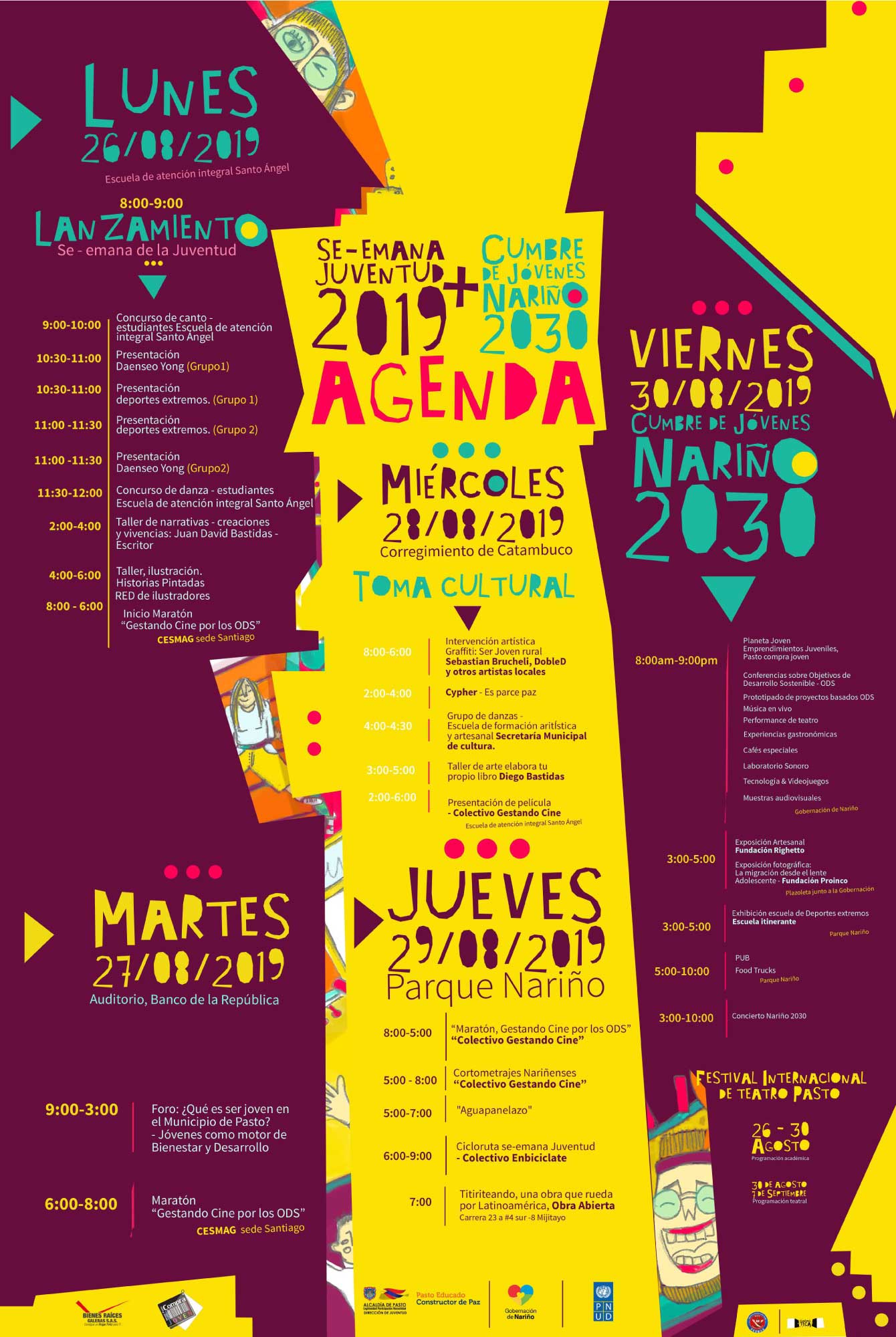 De igual manera, en articulación con la Gobernación de Nariño se realizará la Cumbre de Jóvenes Nariño 2030 la cual versará sobre los Objetivos del Desarrollo Sostenible ODS y contará con la presencia de diferentes personalidades del orden local y nacional, finalizando con el Concierto Se-emana Juventud - Nariño 2030.