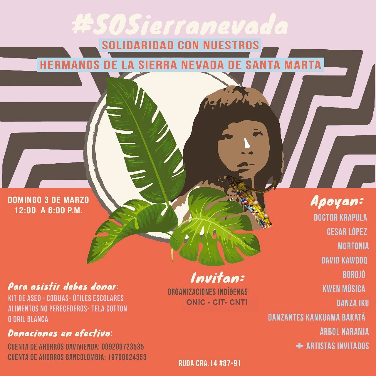 La urgencia de ayuda, necesidad de conciencia y protección ha dado cabida a la iniciativa #SOSierraNevada que busca recaudar donaciones y ayudas para las comunidades que han sido afectadas a través de un concierto en el que comparten escenario Doctor Krapula, Morfonia, Borojó y otros artistas, de la mano de la Confederación Indígena Tayrona