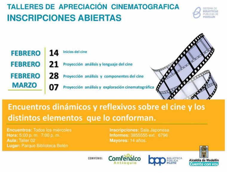 Si les gusta el cine pero quisieran conocer mucho más, el Parque Biblioteca de Belén de Medellín trae para ustedes un taller de Apreciación Cinematográfica en donde podrán conocer su historia, su lenguaje, sus componentes y más. La cita es del próximo 28 de febrero al 7 de marzo de 5:00 p.m. a 7:00 p.m.