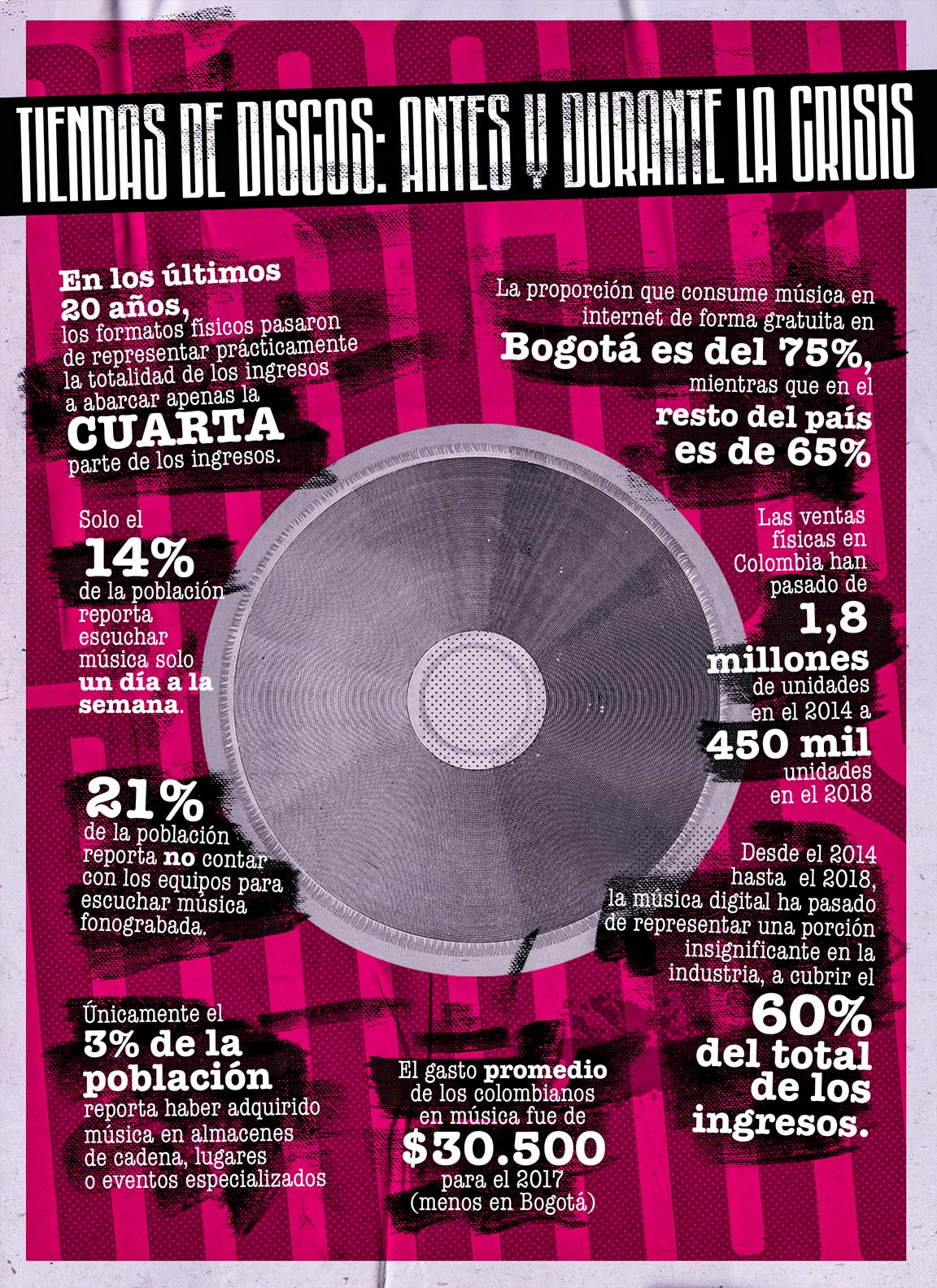 Con la última recolección de datos del Observatorio de la Economía de la Música de Bogotá (un sistema de recolección y análisis de información que busca fortalecer el sector de la música en Bogotá y en Colombia), se vislumbran una cantidad de datos sobre la música grabada y su consumo, que pone una alerta roja sobre las tiendas discográficas. Si bien estos espacios ya venían enfrentándose a varios retos con respecto a las ventas y los procesos de consumo, con el COVID-19 y las medidas adoptadas para su mitigación como la cuarentena y el cierre de establecimientos comerciales, tienen un largo camino para recorrer en vías a estabilizarse, lograr componerse y salir al menos ilesos.