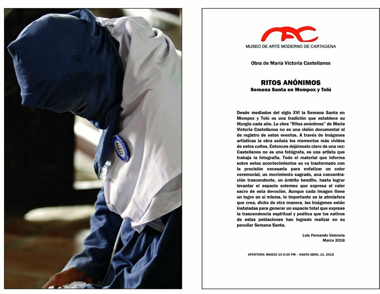 El Museo de Arte Moderno de Cartagena expone por estos días Ritos Anónimos de la artista María Victoria Castellanos, una obra que sintetiza un momento cultural y tradicional misterioso de la Semana Santa de Mompox y Tolú.