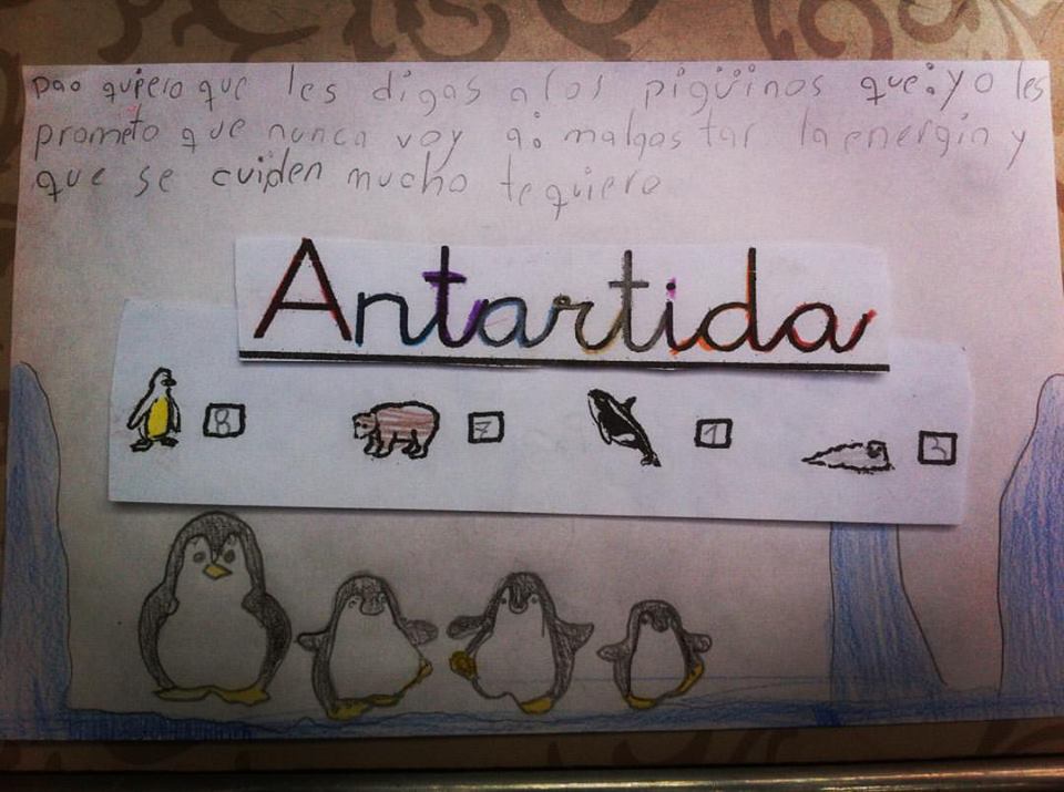 “Cuando finalizamos el taller yo le pido a los niños que escriban una carta para los pingüinos con ideas para cuidar al planeta. Sus cartas me han robado muchas lágrimas y carcajadas porque contestan muchas cosas lindas y son muy pilos nuestros niños, realmente entienden que hay que hacer algo por la madre tierra”, cuenta.
