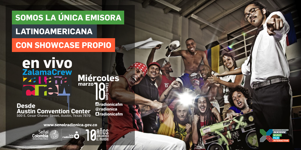 En esta ocasión presentaremos a dos de nuestros artistas de la casa, los que nacieron aquí y seguimos impulsando. Por un lado la experimentación sonora del pacífico colombiano, Zalama Crew, prenderá la mañana texana y pondrá a bailar a los asistentes al evento, ya sea allá mismo, vía fm o vía streamig. Por otro lado, y cerrando el Showcase, los sonidos psicodélicos del caribe y los beats electrónicos champetudos de Bomba Estéreo, rematarán la mañana para ratificar por qué son una de las agrupaciones con más proyección a nivel internacional.
