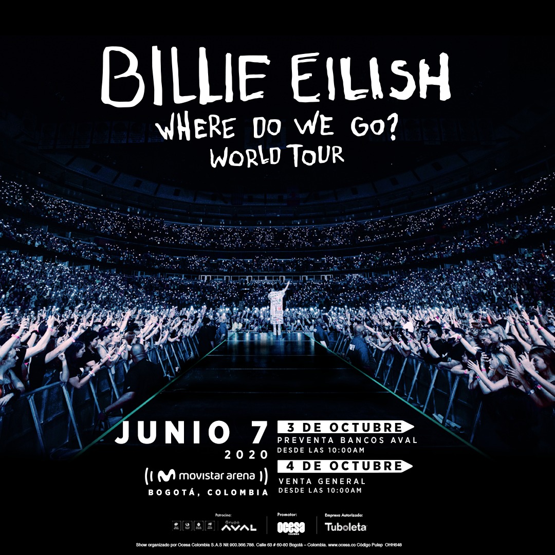 A partir del 4 de octubre estará disponible la venta de boletería al público general para asistir al primer concierto de Billie Eilish en Colombia, la primer artista en tener como número 1 un álbum y un sencillo a sus 17 años, además de ser una de las artistas en encabezar listas musicales con varias de sus canciones como es el caso de la lista de reproducción de Billboard Alternative Songs.