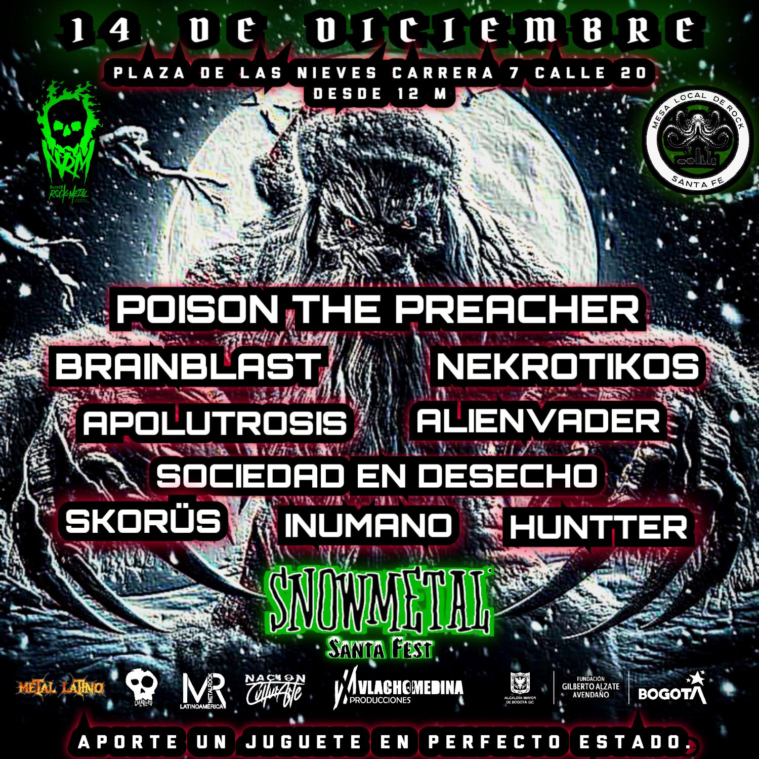 Este año, el SnowMetal SantaFest regresa en su cuarta edición con un poderoso cartel que promete hacer vibrar la Plaza de las Nieves, en el corazón de la localidad de Santa Fe en Bogotá. Este sábado 14 de diciembre, desde el mediodía, el festival contará con la participación de bandas destacadas como Poison de Preacher, Brainblast, Nekroticos, Skorus, Alienvader, Apolutrosis, Sociedad en Desecho, Inumano y Huntter.