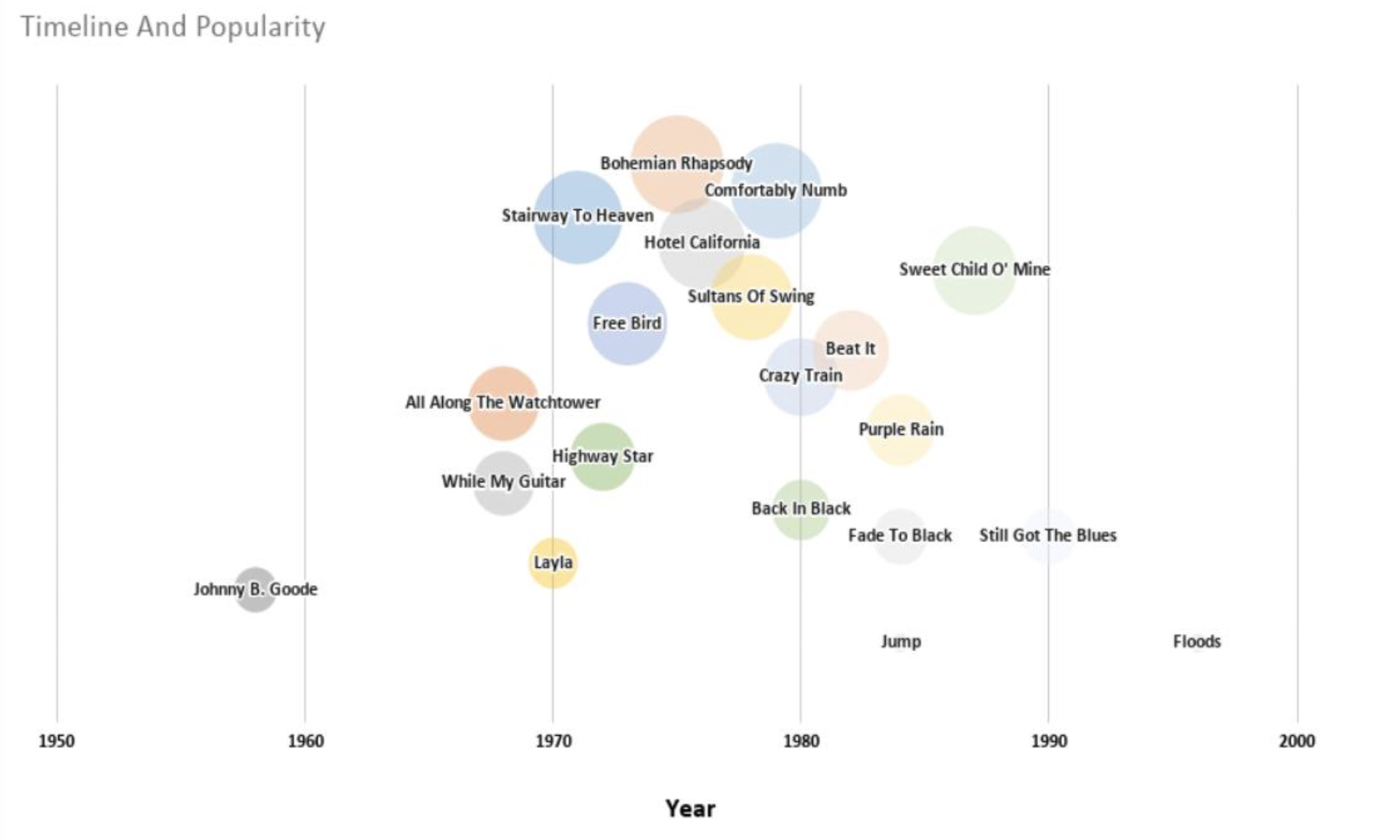 Algunas de las variantes que se analizaron en este experimento fueron el tiempo y la popularidad, los resultados arrojaron que el punto más alto de popularidad de las canciones está entre aquellas que fueron lanzadas a finales de los años 70, con sencillos como “Crazy Train”, “Comfortably Numb”, “Hotel California”.