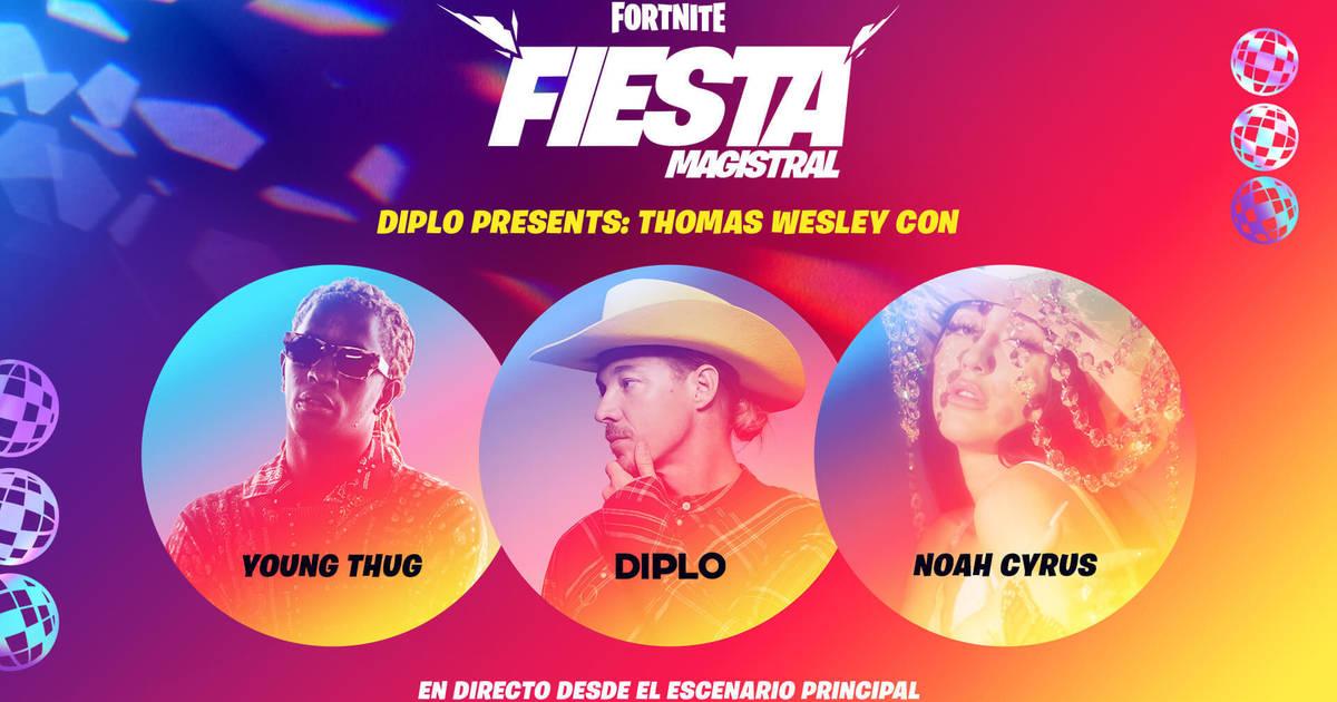 En realidad esta Fiesta Magistral se llevó a cabo el pasado viernes 26 de junio a las 3a.m., este fue el evento que inauguró la Temporada 3 del Pase de Batalla de Fortnite Capítulo 2, tuvo una duración de 18 minutos en total en los que se presentaron Diplo, Young Thug y Noah Cyrus.