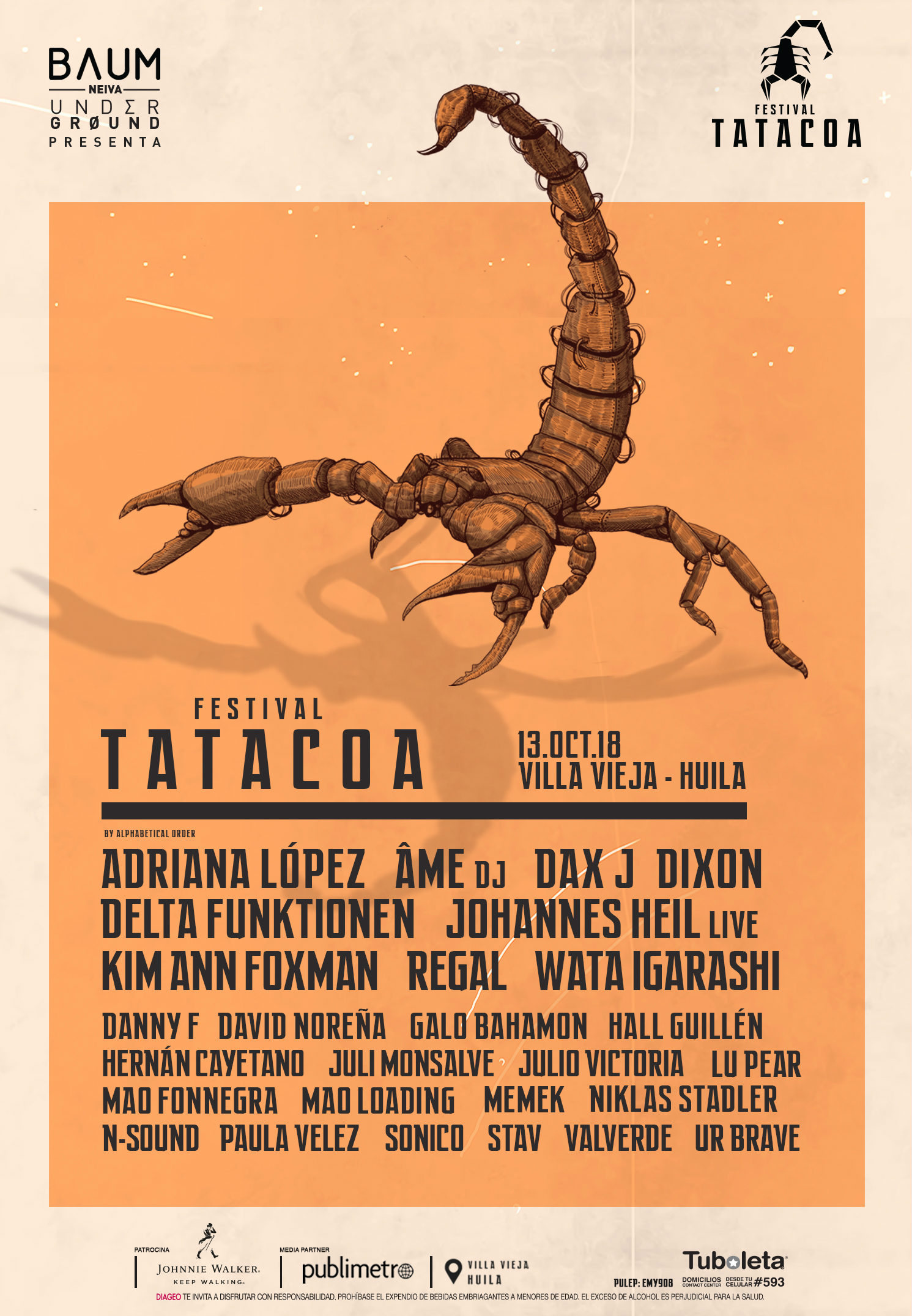 La segunda edición del Festival Tatacoa convocará a miles de guerreros de todo el país que se encontrarán para disfrutar de Dixon, Ame, Dax J, Kim Ann Foxman, Wata Igarashi, otro puñado de actos claves en el circuito internacional , y una gran selección de talento nacional que incluye a Julio Victoria, Adriana López o Sónico, quienes bajo la premisa del festival "nos guiarán hacia la redención musical total que nos concederá el dios Escorpión, guardian de nuestro dancefloor natural".