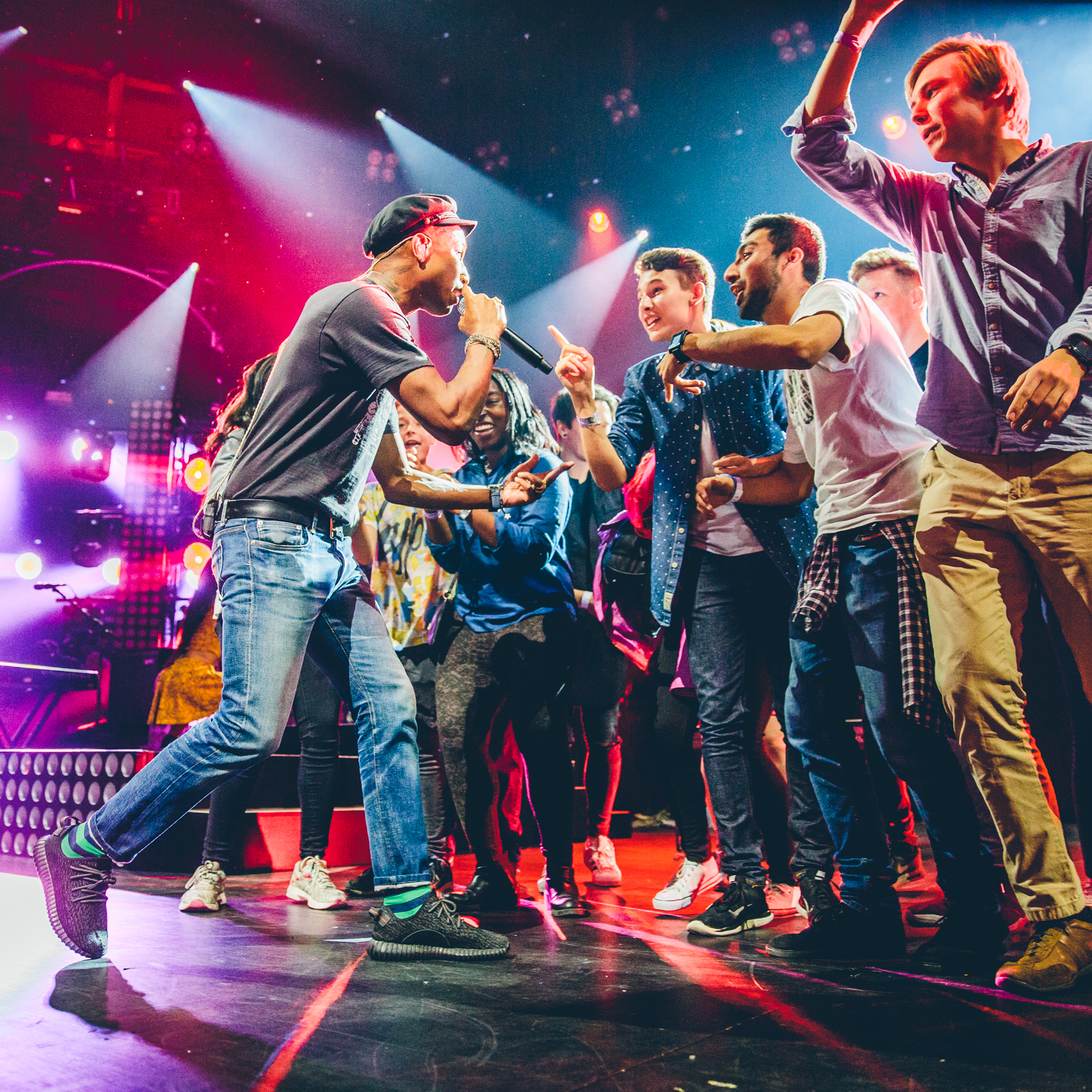 Ya hacia la segunda parte del concierto, las canciones protagonistas fueron aquellas en las que este oriundo de Virginia ha colaborado con otros artistas: Beautiful junto a Snoop Dogg, Lose Yourself To Dance y Get Lucky junto a Daft Punk y Blurred Lines junto a Robin Thicke, para finalmente despedir con Happy acompañado de muchos niños sobre el escenario y repetir Freedom para dejar, muy al estilo de Pharrell, un mensaje positivo en el que invitaba a todos los presentes en el Roundhouse a ser libres, a perdonar y a amar ![]()
