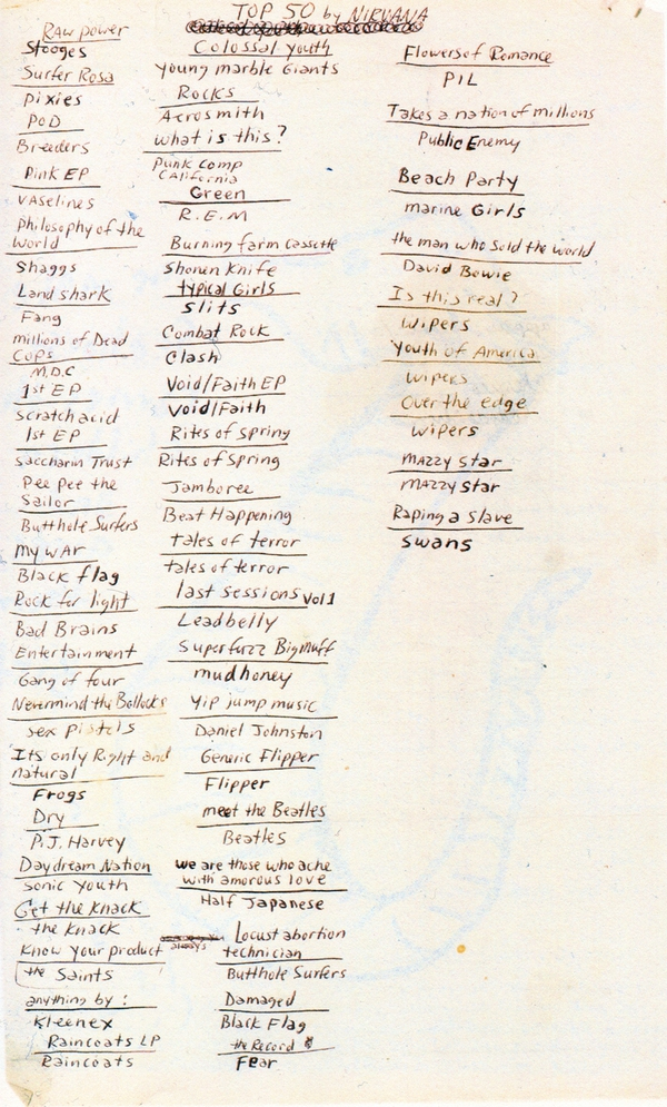 En Radiónica los artistas nunca mueren, y es por eso que, además de recordarlo a dirario amplificando su música, hoy, un día como el de su muerte, lo homenajeamos preguntándonos: ¿Qué música era su favorita?, ¿qué escuchaba?, ¿cuáles eran sus álbumes favoritos?... Pero, ¿cómo lo hacemos? Afortunadamente Cobain anotaba todo, tenía su propio diario. Una de esas anotaciones es un listado con 50 álbumes que para él eran los mejores de toda la historia (ver abajo).