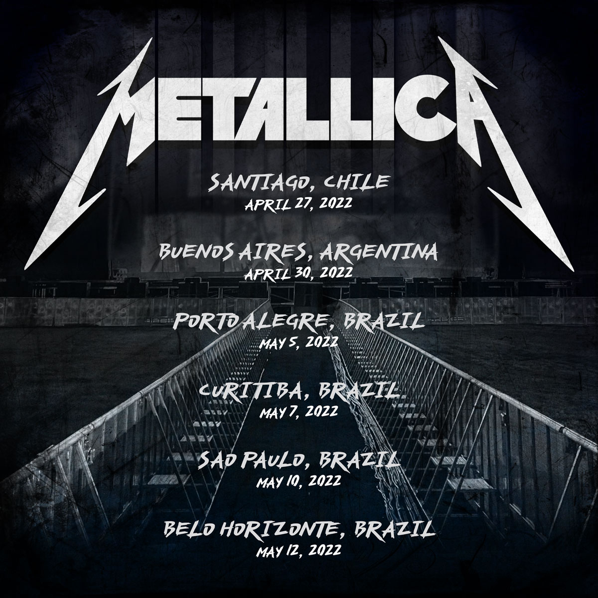 Debido a la pandemia Metallica retrogradó dos veces su gira por Latinoamérica, hasta el momento el futuro de la gira por este lado del continente era bastante incierto, pero llegan buenas noticias para sus seguidores. La banda anunció su presentación en Argentina, Chile y Brasil en abril y mayo de 2022.