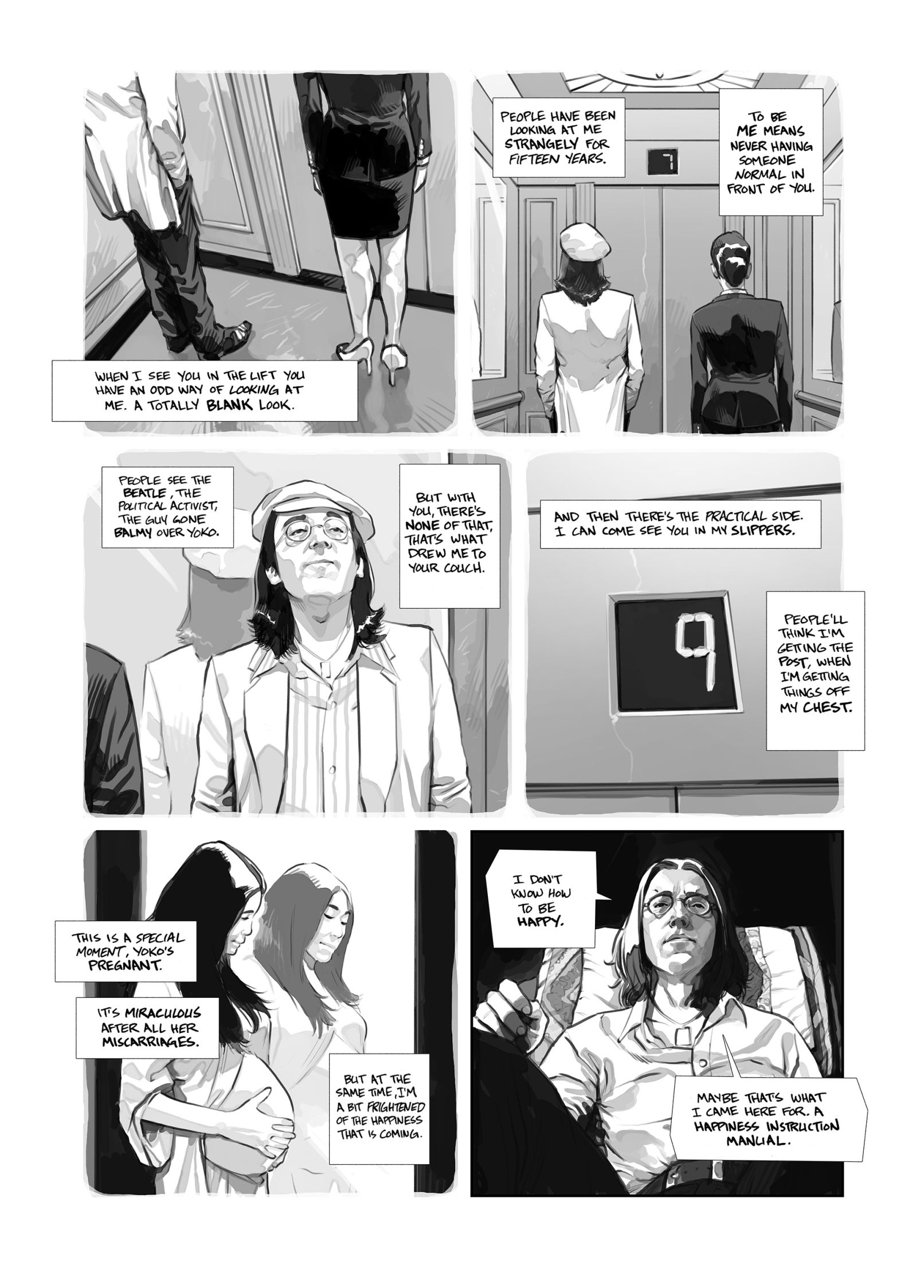 Esta historia casi siempre se ha contado de afuera hacia adentro. Pero esta vez, la adaptación lograda por Cobeyran, en donde es el mismo artista el que habla, logrará transportarnos y mostrarnos los momentos internos que vivió el eterno Beatle durante su vida, la cual se apagó el 8 de diciembre de 1980.