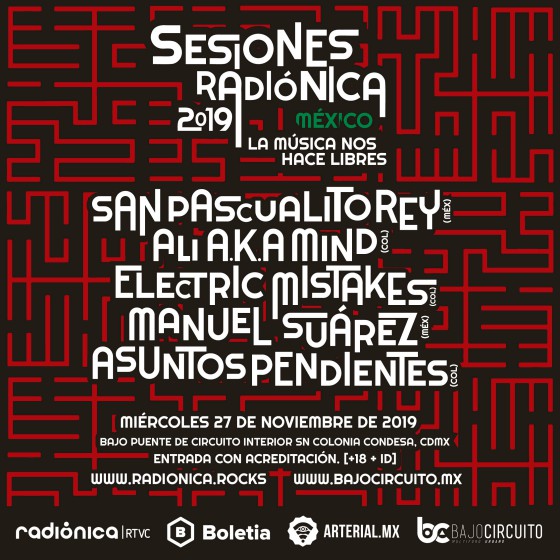 Sesiones Radiónica llega por primera vez a México, con un concierto en el que participarán cinco artistas, Ali Aka Mind, Electric Mistakes y Asuntos Pendientes que llegan desde Colombia, San Pascualito Rey y Manuel Suárez desde México.