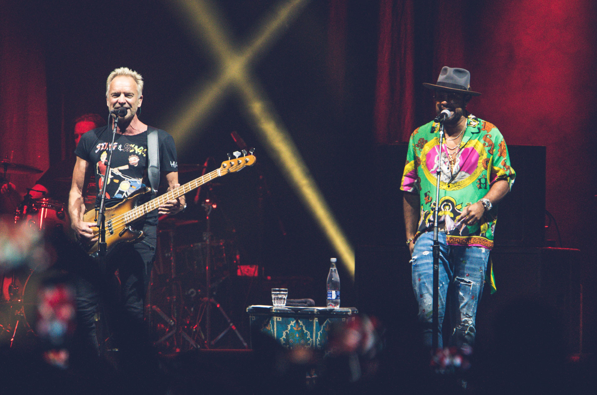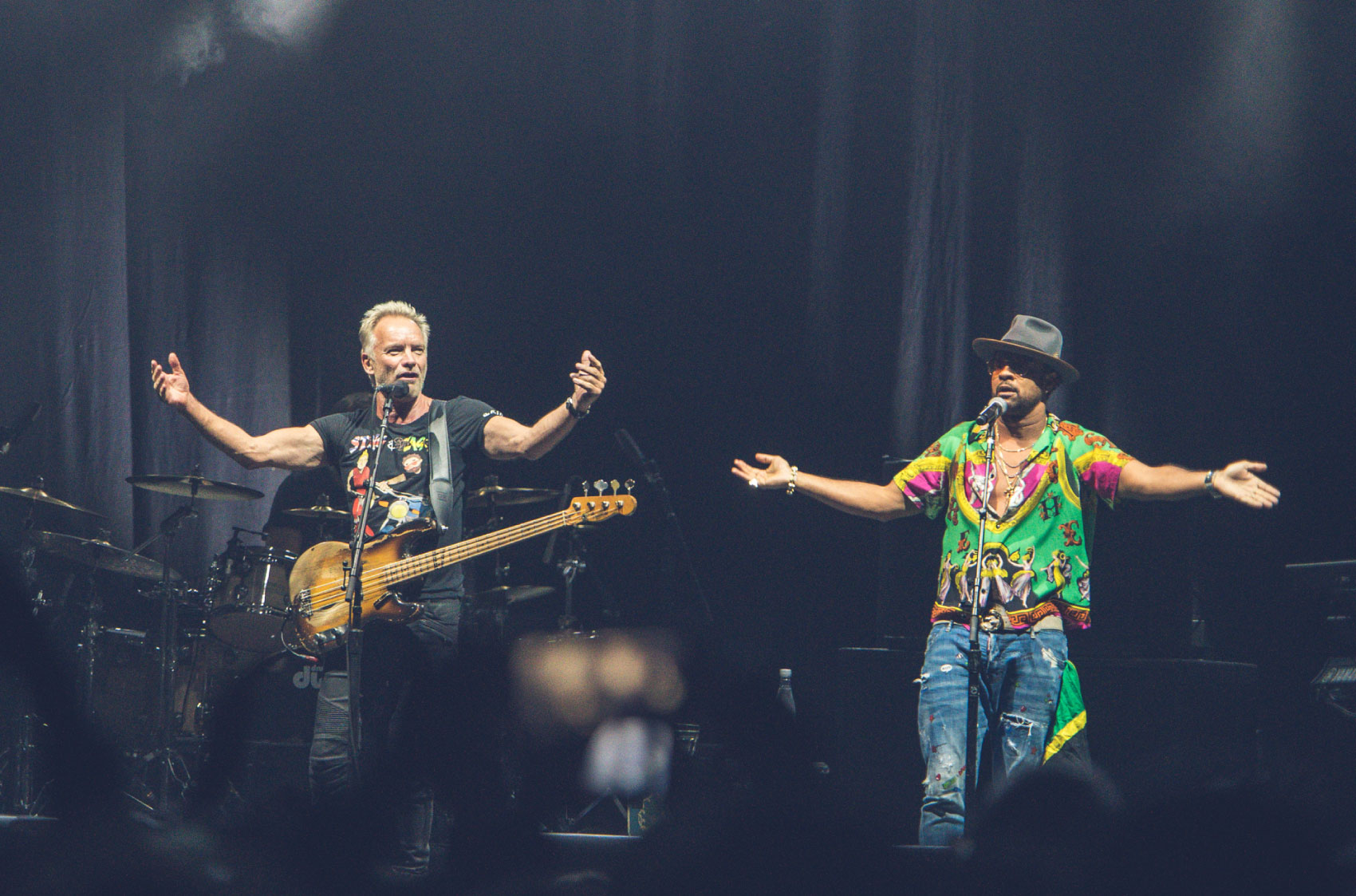 Dos guitarristas, un teclista, un baterista y dos coristas acompañaron a Sting y Shaggy en uno de los conciertos del año en Bogotá. Con las luces bien puestas y un sonido que por fin los oídos agradecen (por lo menos en la parte de abjo del lugar), el dúo inglés-jamaiquino aprovechó cada segundo de tarima, casi que sin pausas y con la potencia al tope.
