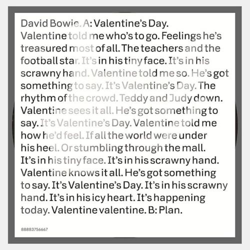 Aún no se conoce la fecha del lanzamiento del clip. Así que por el momento dejamos que disfruten "Valentine`s day", el cuarto sencillo del álbum que marca el regreso de Bowie. A continuación compartimos la nueva canción y la imagen del vinilo.