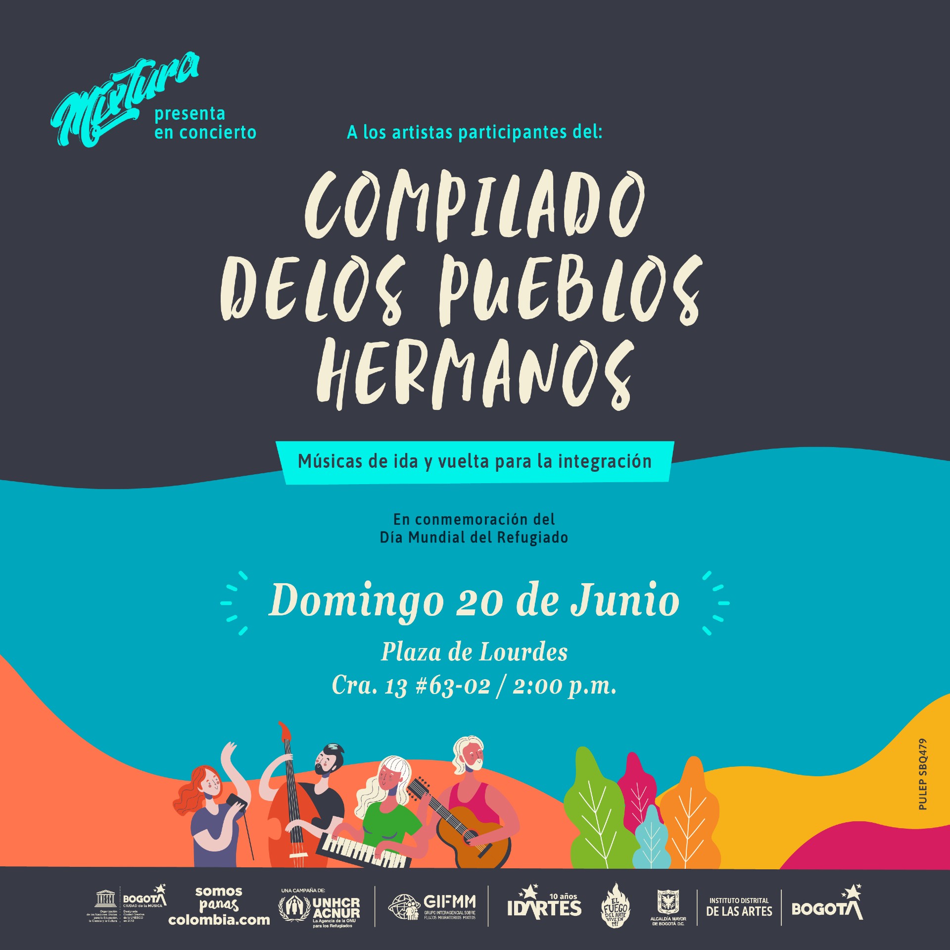 Teniendo en cuenta lo anterior, el próximo domingo 20 de junio se realizará la primera puesta en escena del Compilado de los pueblos hermanos: músicas de ida y vuelta para la integración, un trabajo discográfico que se lanzó en el mes de abril y que tiene artistas colombianos y venezolanos. Según Gabriela Abello, líder del programa de Mixturas del Idartes,“Esto se logró bajo un proceso de intercambio de repertorios, en el que se buscó generar un hermanamiento desde la creación musical y la reinterpretación de música entre estos pueblos para levantar lazos de amistad”.