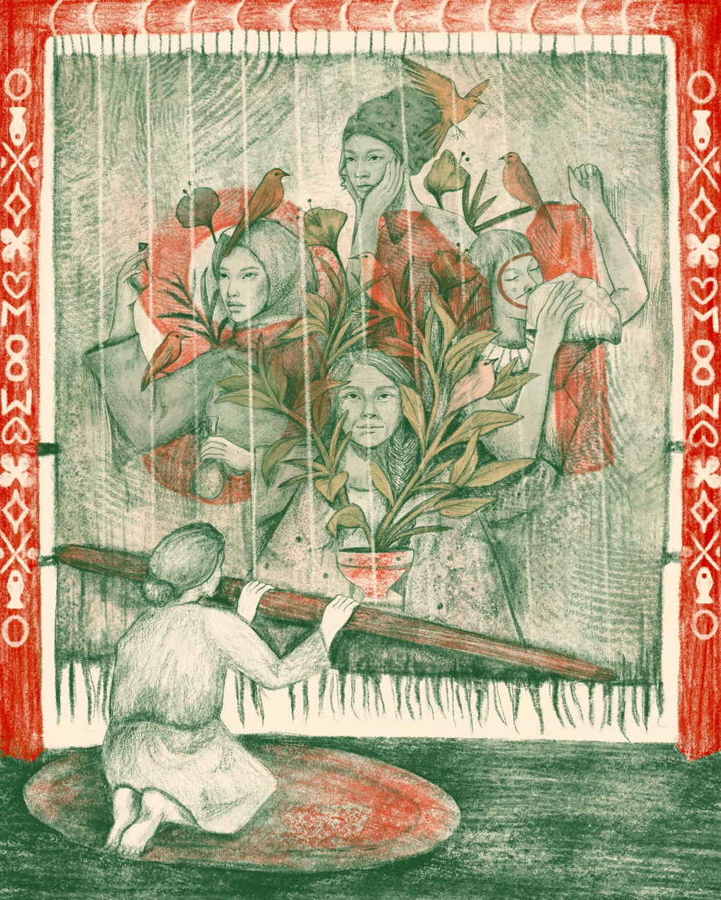 La ilustración representa a una sirena madre con una niña. Para mí, es como ese juego con las casitas, con la abundancia, y en el arco están los ancestros. Postulé esta obra a Bacánika, aunque sentía que era algo lejanísimo, como que yo estaba en mi montaña y eso pasaba allá, en la capital.