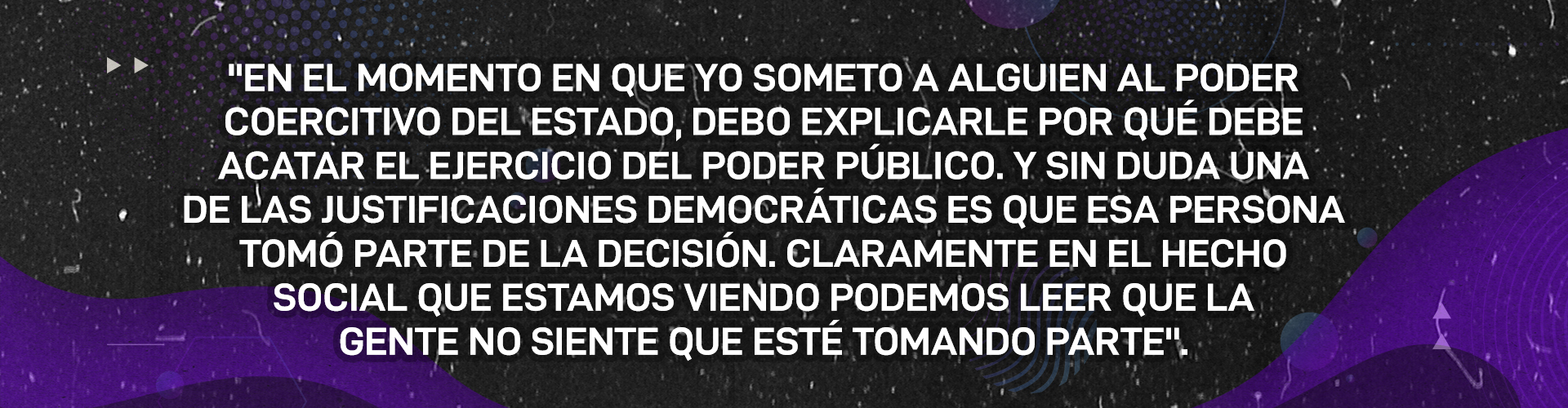 Eso es lo que hace reconciliable la libertad con el ejercicio del poder público y esto debe preocuparnos. En el momento en que yo someto a alguien al poder coercitivo del Estado, debo explicarle por qué debe acatar el ejercicio del poder público. Y sin duda una de las justificaciones democráticas es que esa persona tomó parte de la decisión. Claramente en el hecho social que estamos viendo podemos leer que la gente no siente que esté tomando parte. Puede sentir esa unilateralidad en el ejercicio del poder público, puede sentirse únicamente súbdito de ese poder y yo creo que institucionalmente hay que mejorar eso.