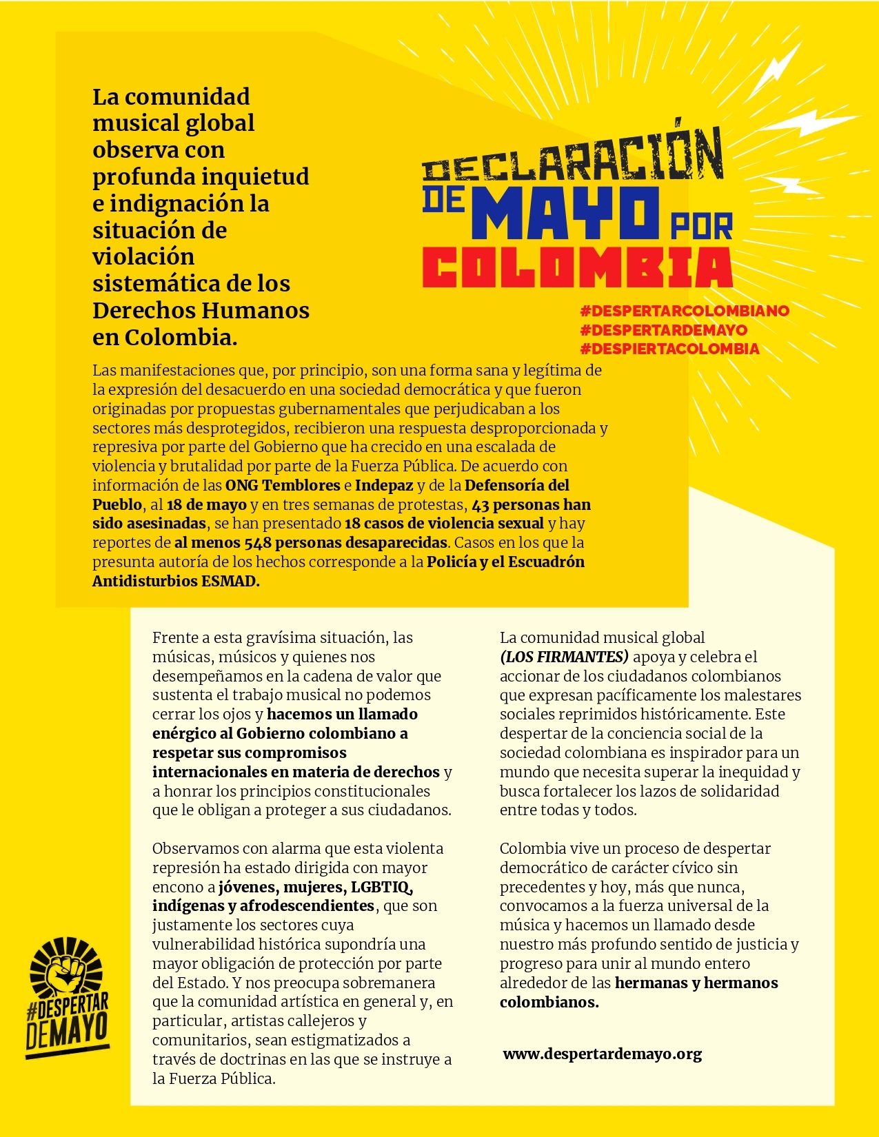 Recientemente vio la luz una comunicación firmada por artistas de varios lugares del mundo titulada “Declaración de mayo por Colombia”. En esta, los participes manifiestan su inquietud e indignación por “la situación de violación sistemática de los Derechos Humanos” en el país. Artistas como Rubén Blades, Catalina García, Gustavo Santaolalla, Camila Moreno, Residente, Rubén Albarrán, Jorge Drexler, Vetusta Morla, Lido Pimienta, Edson Velandia, Tweety González, Juan Pablo Vega, Hugo Candelario, entre muchos otros -incluyendo varias organizaciones musicales alrededor del mundo- aparecen como firmantes.