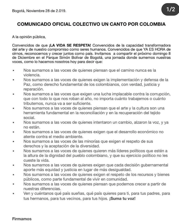 El actor Santiago Alarcón (El man es Germán), convocó a realizar un concierto a propósito del Paro Nacional, un llamado al que varios artistas fueron correspondiendo. A través de su cuenta de Twitter le escribió a la Alcaldía de Bogotá que le permitiera llevar a cabo esta gestión. “¡Porque queremos sumar nuestro canto para unir nuestras voces! Queremos cantar en el Parque Simón Bolívar el domingo 8 de diciembre. Señores Alcaldía Bogotá”, plasmó en un primer tuit. A lo que agregó: “Sabemos que estamos muy encima de la fecha y que cada evento requiere un proceso, pero dadas las circunstancias que vivimos actualmente en el país, pedimos que el próximo domingo 8 de diciembre se nos permita cantar en el parque Simón Bolívar”.