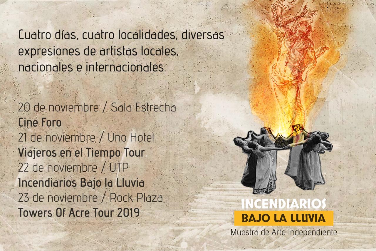 Incendiarios Bajo La Lluvia, Muestra de Arte Independiente es el nombre del festival, y para este 2019 se realizará entre el 20 y 23 de noviembre en cuatro espacios diferentes, con invitados internacionales, nacionales y locales.