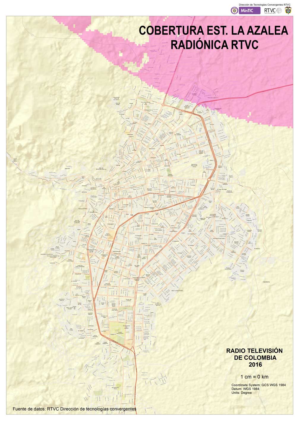 Cobertura La Azalea Radionica anterior: En esta gráfica se puede apreciar en color rosa el área de servicio (66dB) de la emisora Radiónica de la Azalea, antes de la reorientación de antenas realizada durante el año 2015. En esa área de servicio se debe garantizar un cubrimiento excelente de la señal; sin embargo, la señal puede ser recibida con menores niveles de intensidad de campo, con buena calidad de recepción.