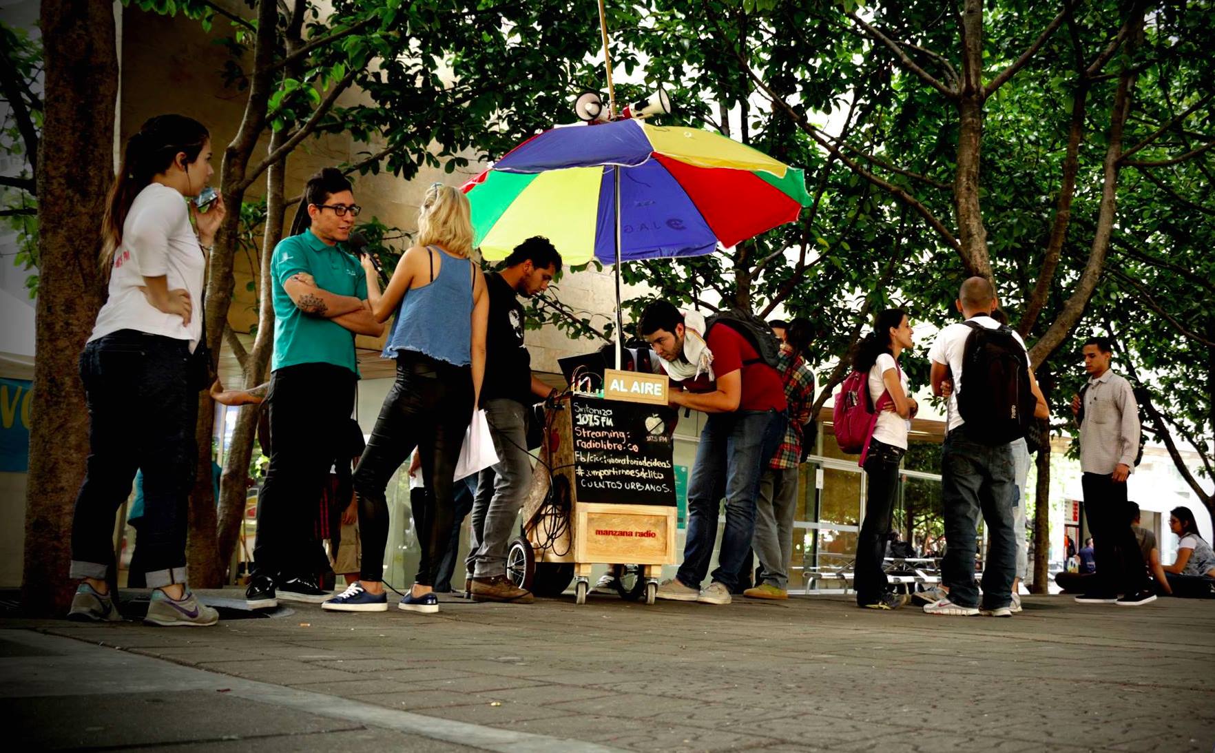 Si hay algo que la tecnología ha permitido es cambiar algunas reglas de juego en la forma de hacer las cosas. Una de ellas es la radio: ahora se puede hacer radio desde cualquier lugar con pocos elementos. Una consola, dos micrófonos, un computador y un transmisor o una señal de transmisión para la red con conexión a internet y listo: puedes arrancar a emitir, lo demás es ingenio. Este sencillo proceso de producción ha sido implementado por el colectivo Manzana Radio, solo que en su caso, quisieron sacar la radio de un cuarto y llevarla a las calles para caminar con ella contando historias a su paso.