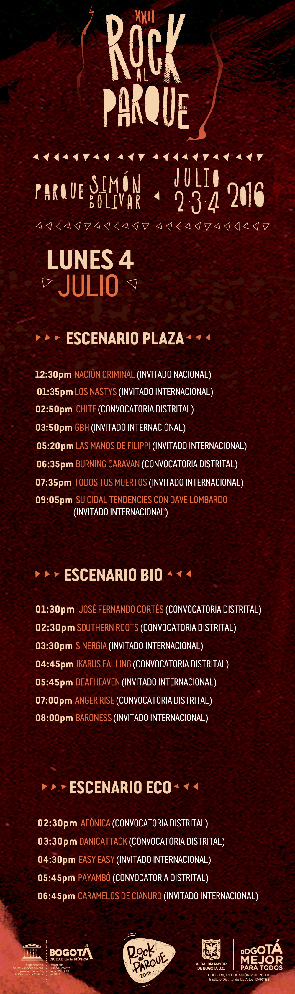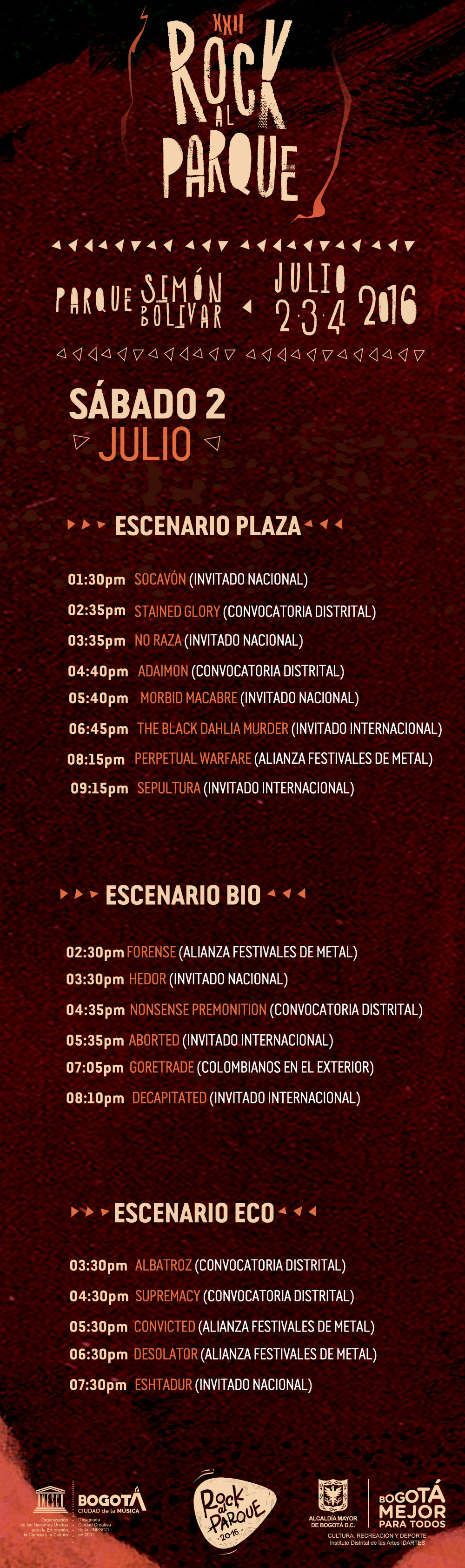 El primero de 3 invitados distritales que este año conformarán el cartel de Rock Al Parque. Hizo parte del Tributo al metal bogotano que en 2014 se llevó a cabo en el festival y que en esta ocasión tendremos con un show completo y conmemorativo de sus 10 años.