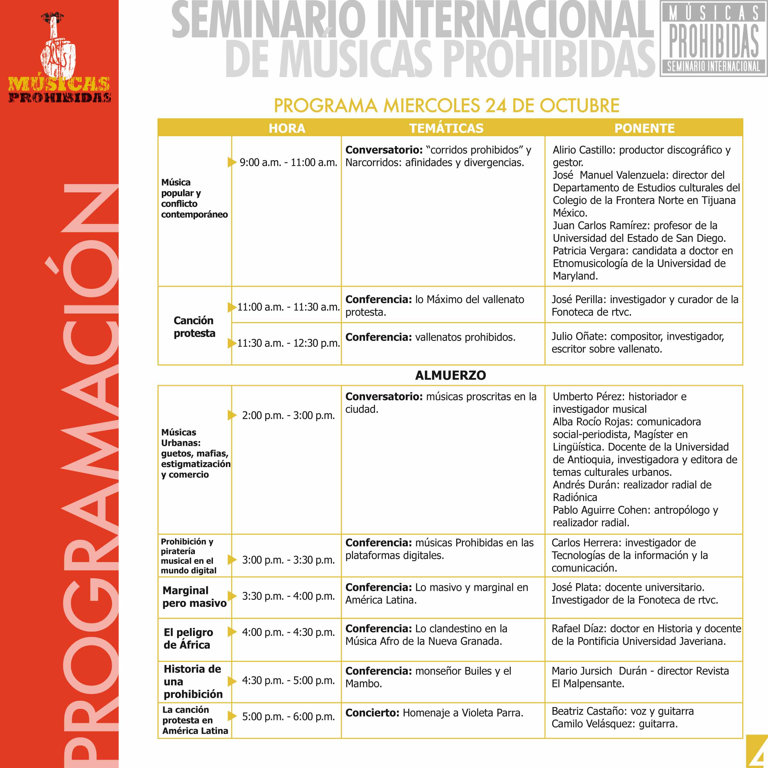 Asimismo, la Radio Nacional de Colombia ha hecho lo propio en sus espacios y ahora la Fonoteca de rtvc ha organizado el Seminario de Músicas Prohibidas, que se realizará el martes y miércoles 23 y 24 de octubre desde las 9 a.m en el Museo Nacional, invitando a la reflexión sobre el tema y para concatenar la mayoría de puntos de vista posible, a través de varios invitados del mundo de la música, los medios de comunicación y la literatura.