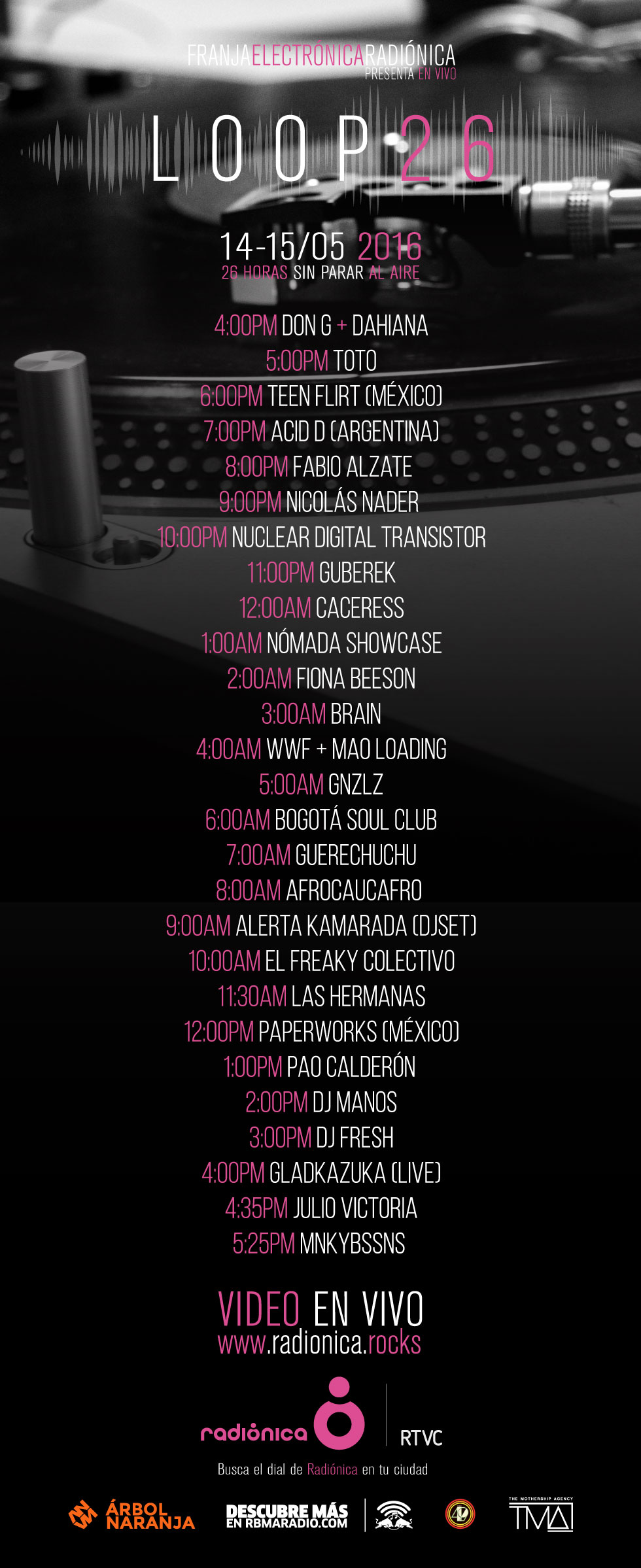 La jornada del fin de semana de #Loop26 no será normal. Durante 26 horas seguidas 45 artistas entre DJs y VJs harán sus mejores sets y lives en nuestros estudios desde donde transmitiremos vía fm y web (video) todo lo que aquí pase.